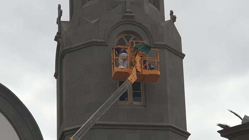 La empresa a la que la Parroquia de San Juan le encargó los trabajos de pintado del exterior del templo y archivo parroquial y barnizado de sus puertas y ventanas daba este miércoles los penúltimos brochazos de barnizado a las maderas de los huecos de las torres neogóticas de la fachada principal.