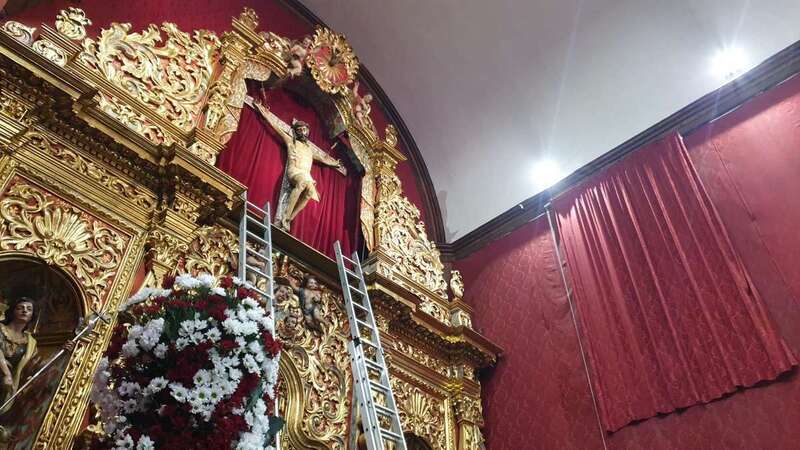 En ese momento, los seis porteadores que habitualmente llevan a cabo esta delicada maniobra, una tarea que se transmite de padres a hijos o allegados, subieron en busca del Santo Cristo, la imagen cristológica más venerada dentro de la Diócesis de Canaria.