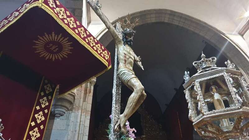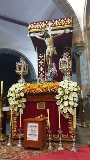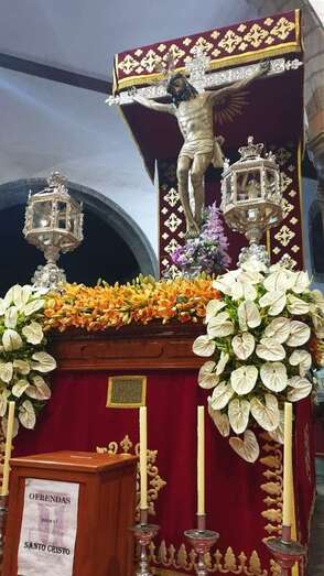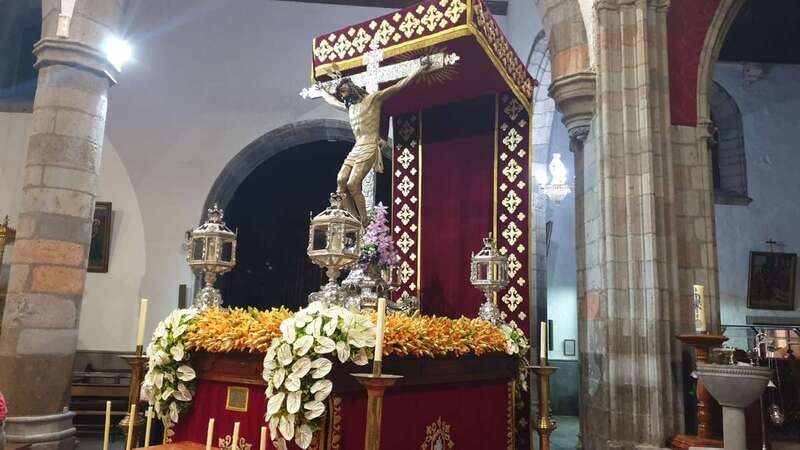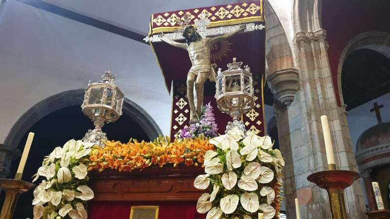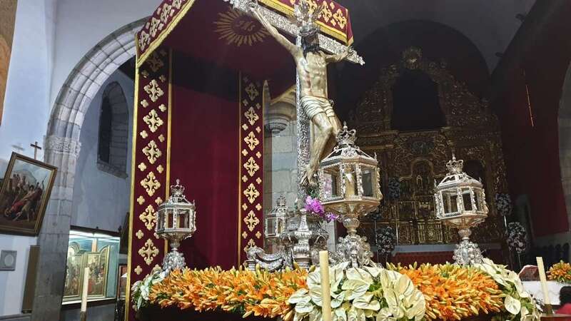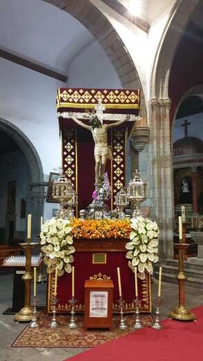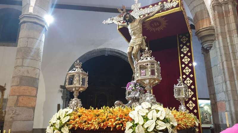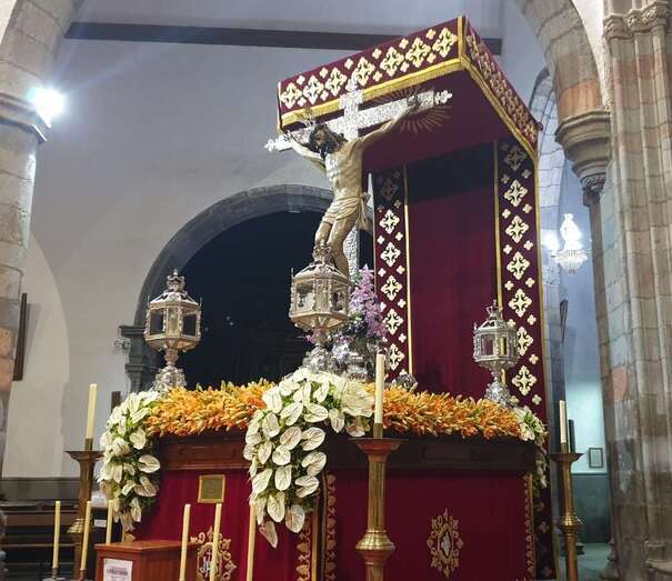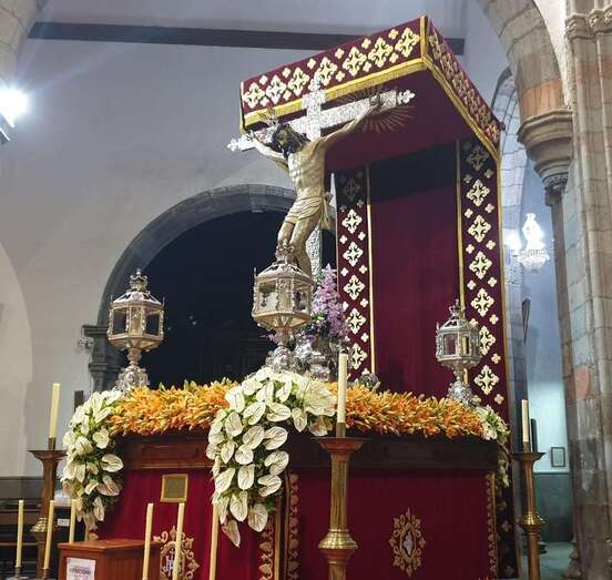 Telde.- El trono del Santo Cristo de Telde, bellamente engalanado, ya está preparado para la procesión religiosa de esta tarde por las calles del casco histórico de la ciudad con salida y llegada a la Basílica de San Juan.