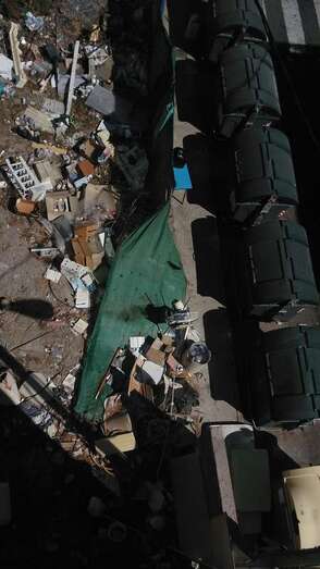 Un terreno que linda con un edificio y próximo a una parada de guaguas, y en el que se acumulan desperdicios de todo tipo: basura, escombros, residuos, recipientes con tierra y otras sustancias, muebles, colchones, etc.