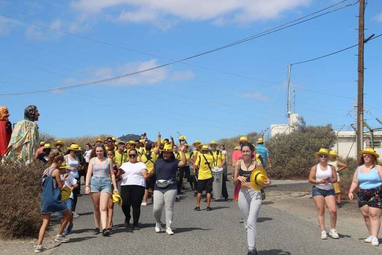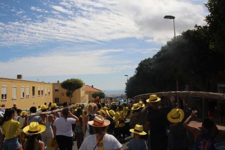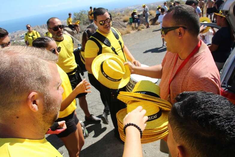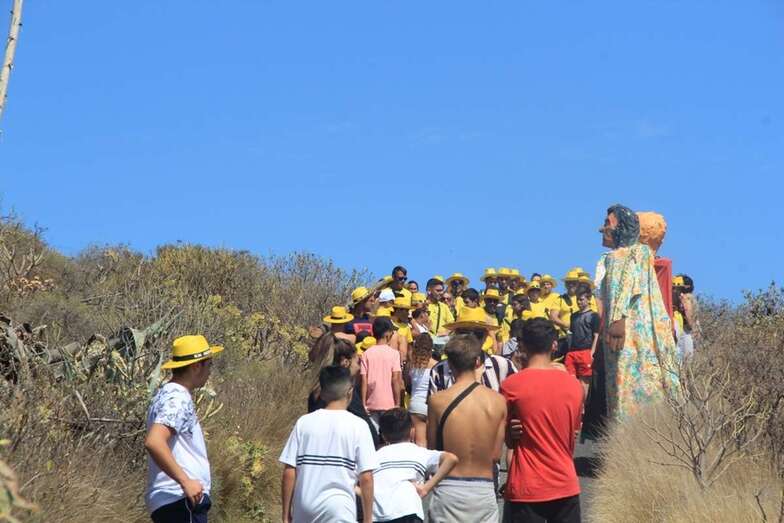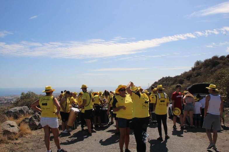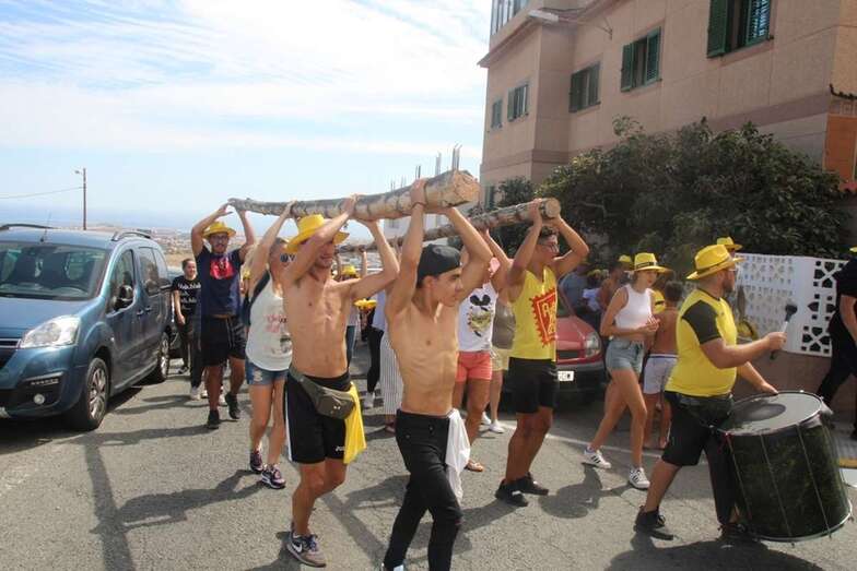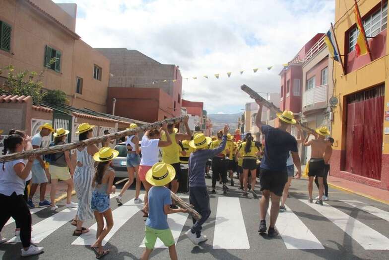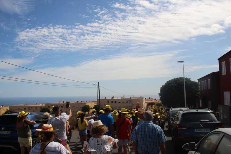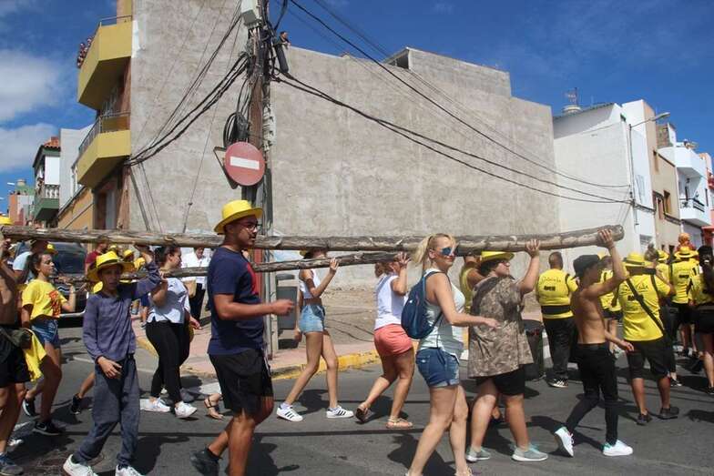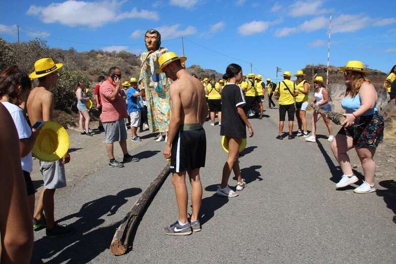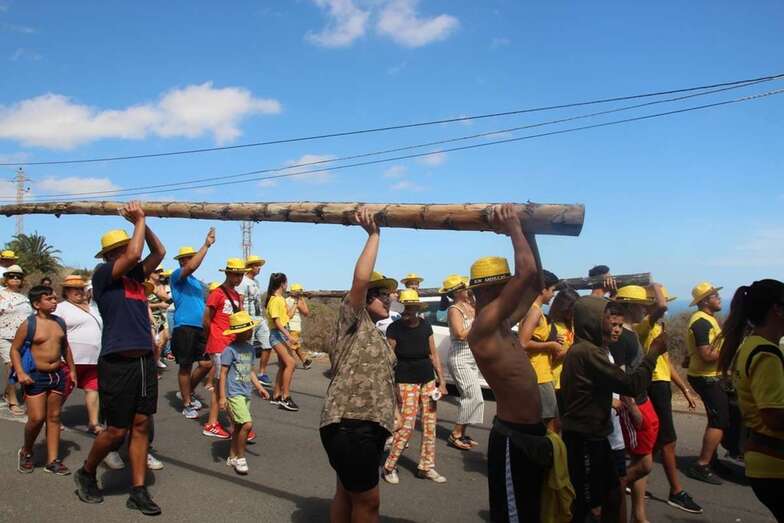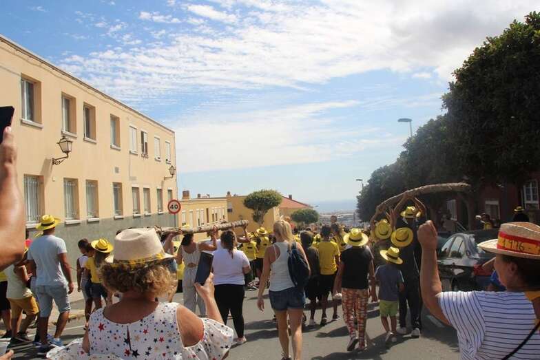 Allí tuvo lugar por la organización el reparto de camisetas y sombreros de color amarillo donados por la firma Arehucas y pocos minutos comenzaba la bajada a hombros de dos lustrosos troncos de pita al son de la música de Samba Isleña.