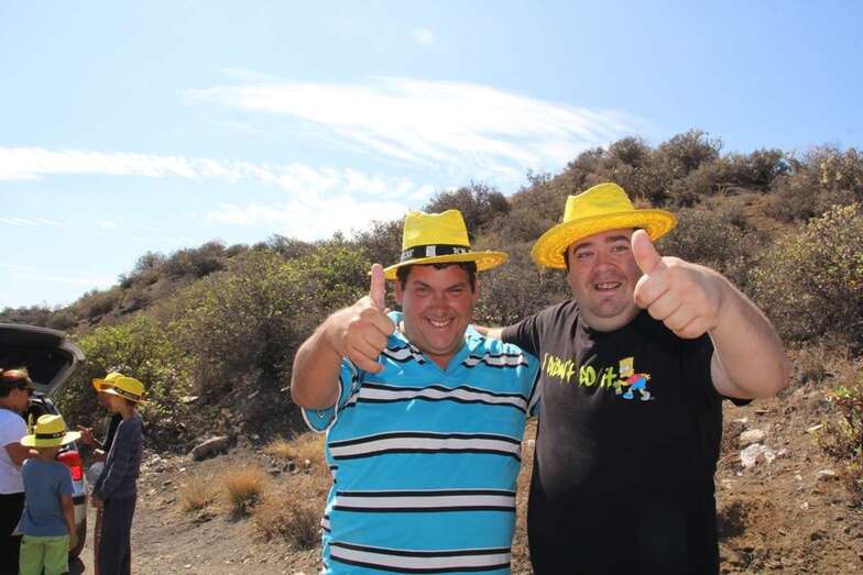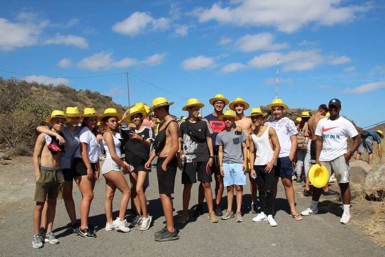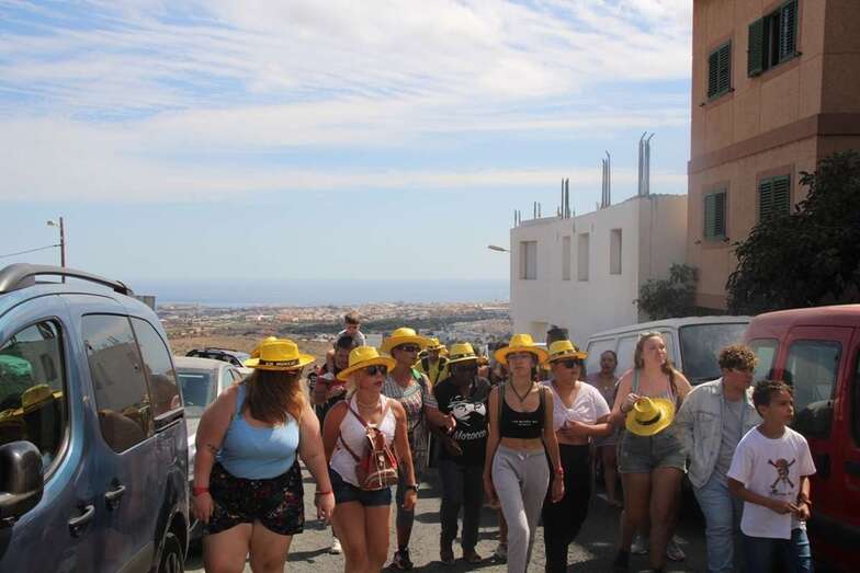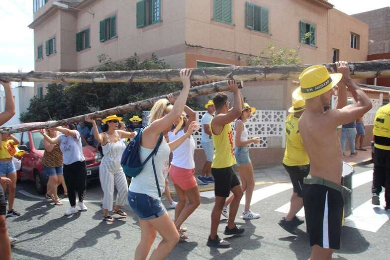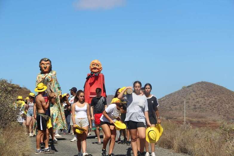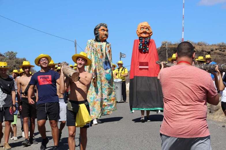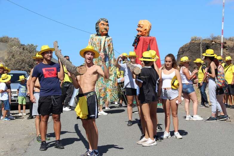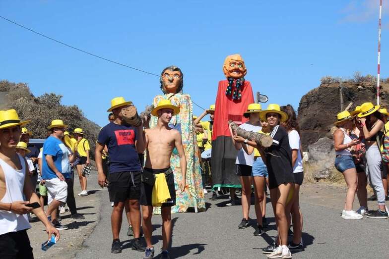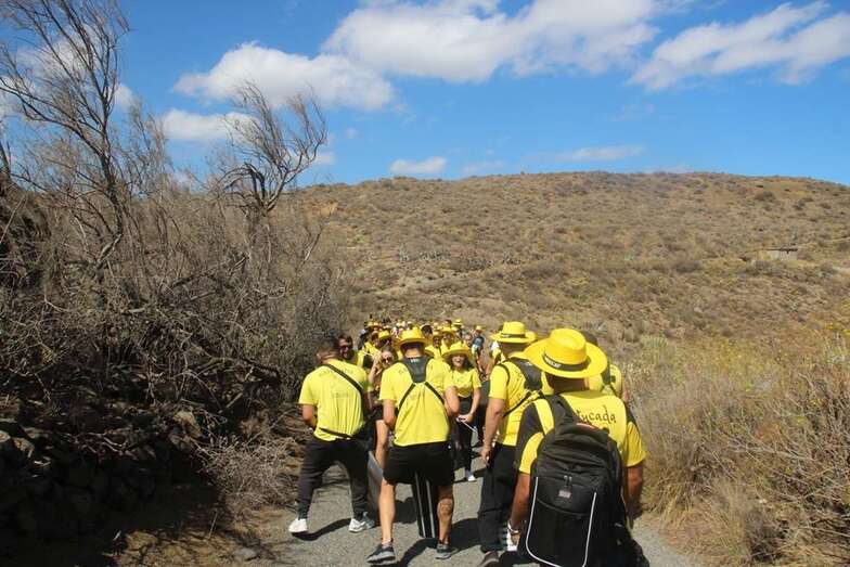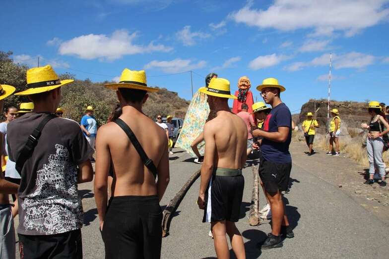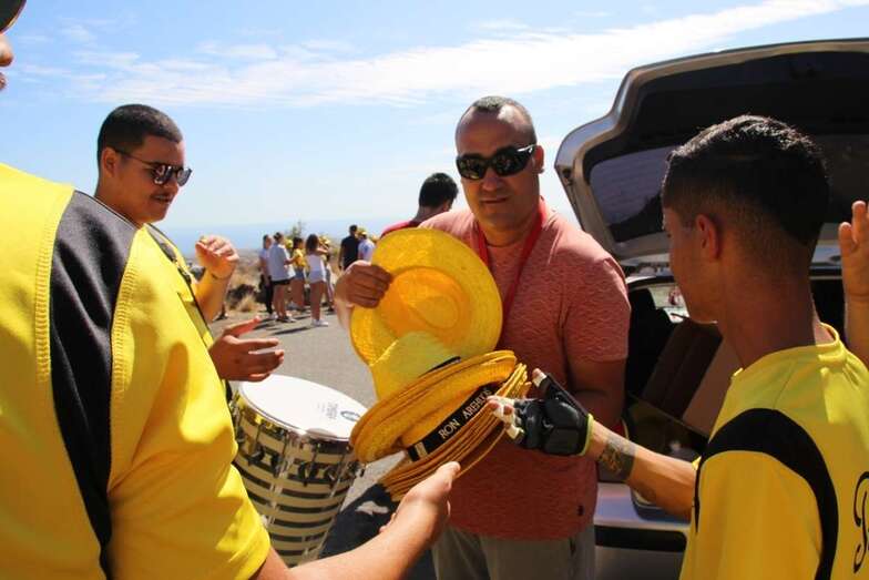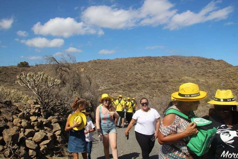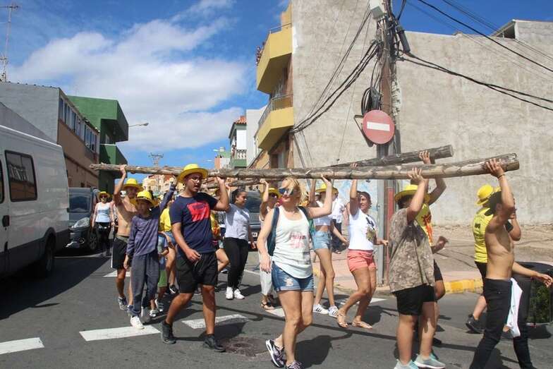 Allí tuvo lugar por la organización el reparto de camisetas y sombreros de color amarillo donados por la firma Arehucas y pocos minutos comenzaba la bajada a hombros de dos lustrosos troncos de pita al son de la música de Samba Isleña.