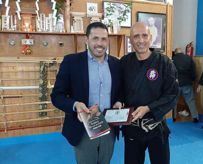 Telde.- El alcalde de Telde, el nacionalista Héctor Suárez (Coalición Canaria), visitó este martes por la mañana el Centro de Artes Marciales y Defensa Personal Bujinkan Unryu Dojo, en Los Llanos y fue nombrado miembro de honor por su director, Pedro Fleitas, quien le hizo entrega de una placa honorífica y de su último libro, Diario de un artista marcial.