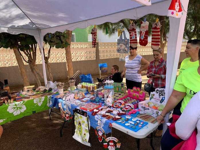 Bajo una carpa se instaló un pequeño rastrillo solidario para recaudar fondos para el proyecto Experiencia Gambia.