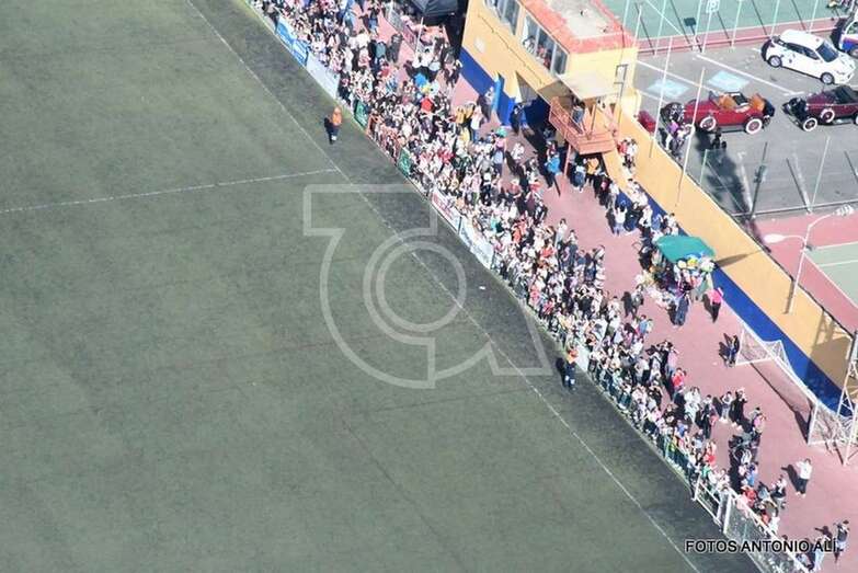 Tras su llegada en la aeronave, sus majestades comprobaron la alegría y los nervios de los más pequeños y, visiblemente emocionados, se han ido acercando hasta las gradas para poder verles de cerca darles la mano, un beso y, los más afortunados, un abrazo. Fue un momento en el que los más pequeños volvieron a mostrar sonrisas imborrables en sus rostros pues, además, tuvieron la oportunidad de entregar personalmente a los Reyes las cartas con sus peticiones para esta noche y fotografiarse con su monarca favorito.