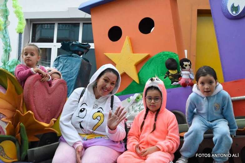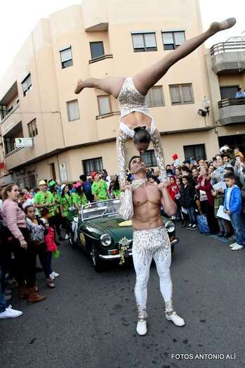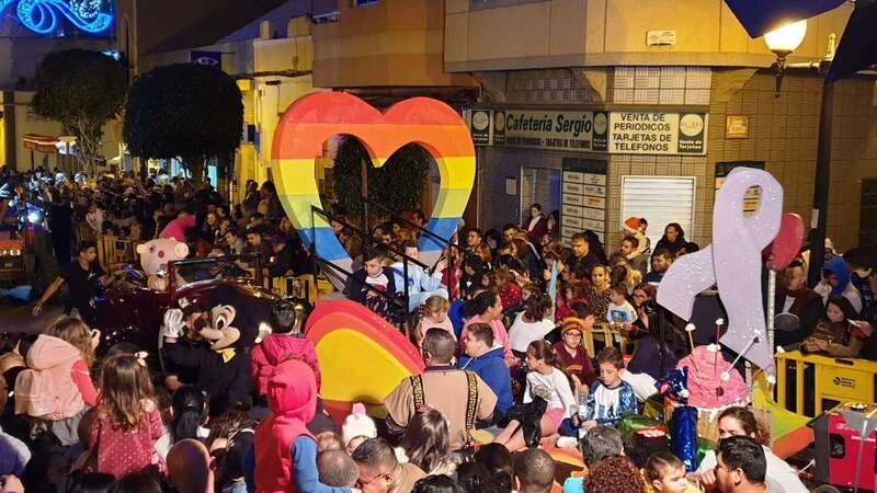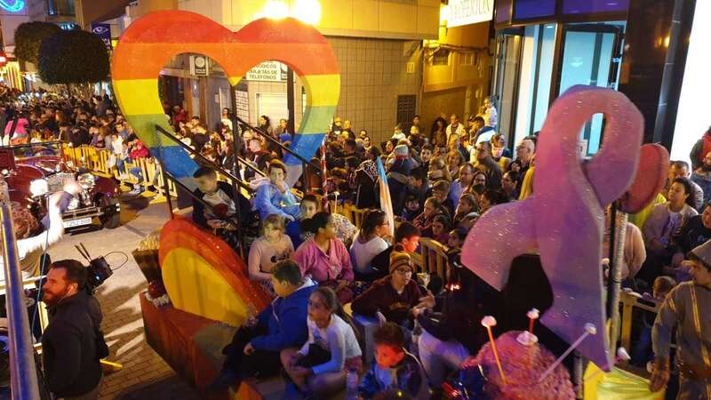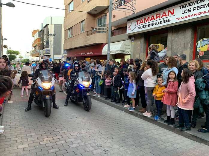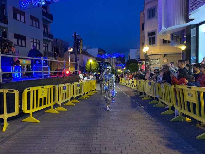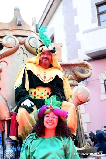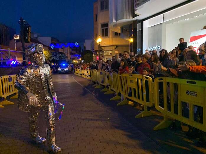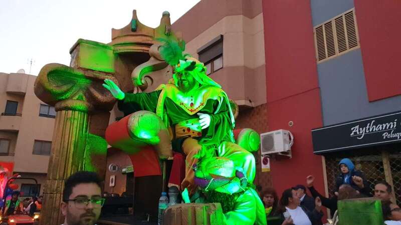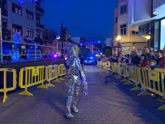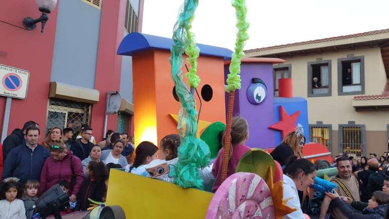 La vistosa comitiva, que dejó cientos de kilos de caramelos por las calles de la zona comercial abierta de Telde, estaba integrada por coches antiguos, batucadas, pajes, malabares, personajes de dibujos animados y la pareja Levi y Estrella -los finalistas del programa televisivo Got Talent, entre otros. Todo un espectáculo conformado por siete carrozas y cerca de 200 figurantes.