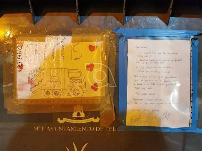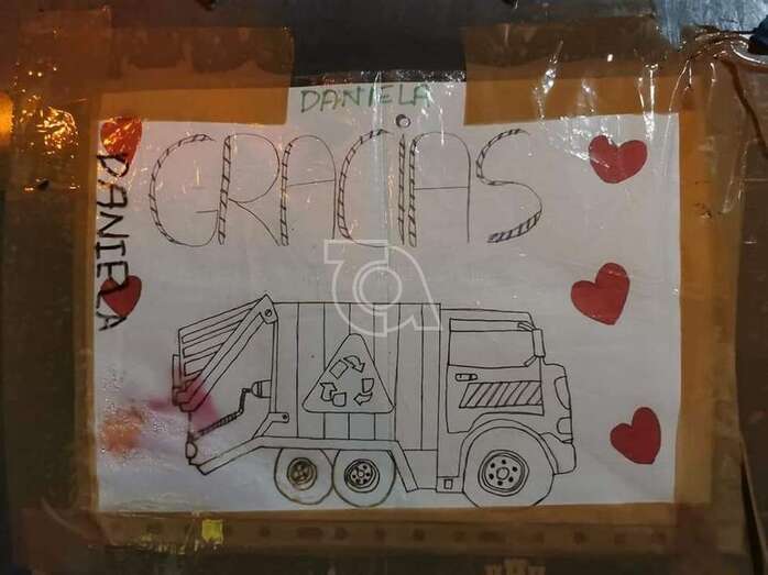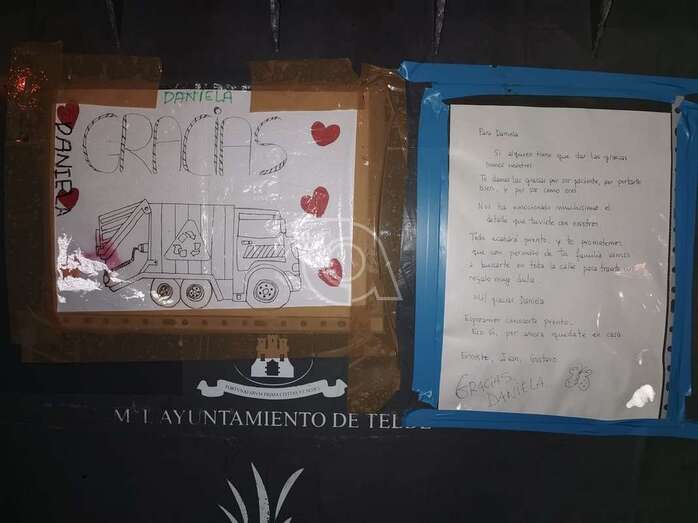 Telde.- Los operarios que atienden el servicio de Recogida de Residuos en el núcleo poblacional de La Majadilla se quedaron días atrás sorprendidos al ver adherido a los recipientes un dibujo de agradecimiento de Daniela, una pequeña del barrio.