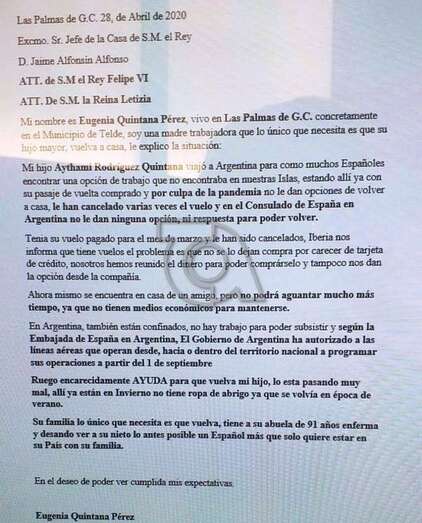 Eugenia Quintana, la madre de Rodríguez, solicitó también por carta la mediación del Rey Felipe VI, a quien pidió su ayuda para que su hijo pueda salir de Argentina. “Lo está pasando mal. Allí ya están en invierno y no tiene ropa de abrigo que se volvía en época de verano”, manifiesta apenada en la misiva que remitió el pasado 28 de abril a la Casa Real Española.