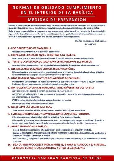 El aforo máximo permitido en la Basílica de Telde en estas tres fases será de 90 personas, teniendo en cuenta las dimensiones del templo y la separación establecida entre los fieles (1,5 metros). No se permiten visitas turísticas y/o culturales durante las fases 1 y 2 de la desescalada.