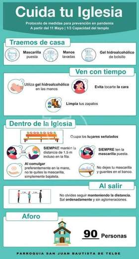 El reinicio de la actividad se hará siguiendo las medidas de seguridad decretadas para los templos de culto y siguiendo las directrices de la Diócesis de Canarias. A partir de esta fecha se permite la asistencia grupal, pero no masiva, a los templos sin superar el tercio del aforo, con Eucaristías dominicales y diarias, respetando la distancia de seguridad entre los feligreses.