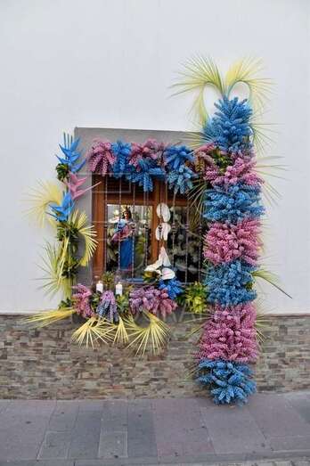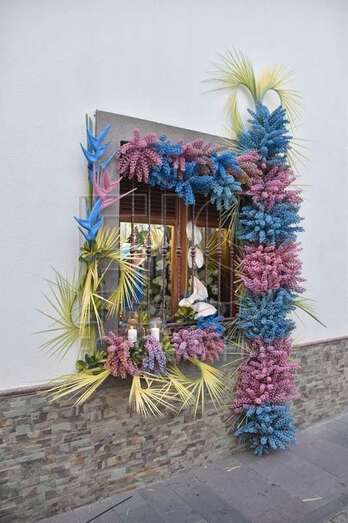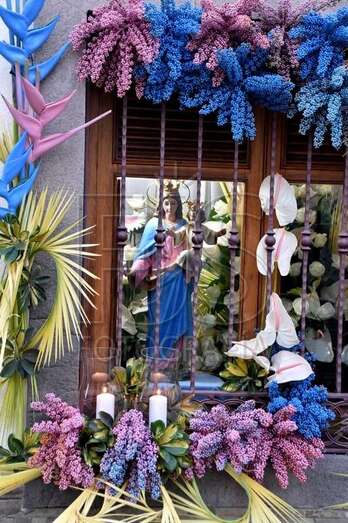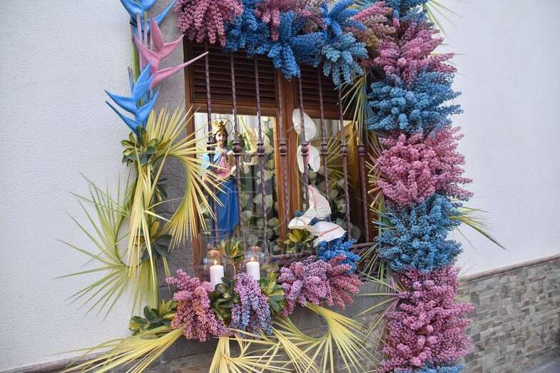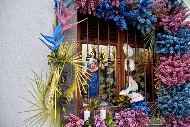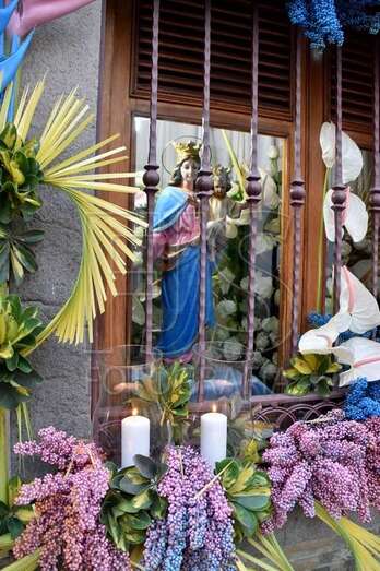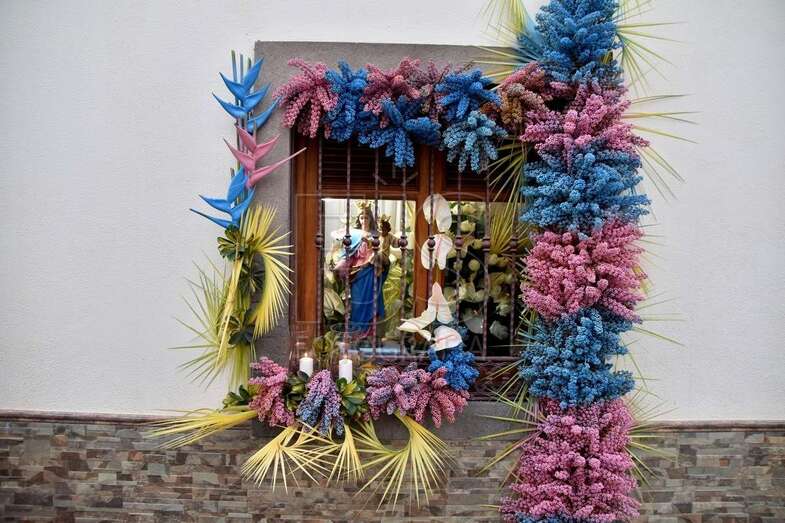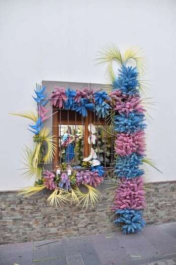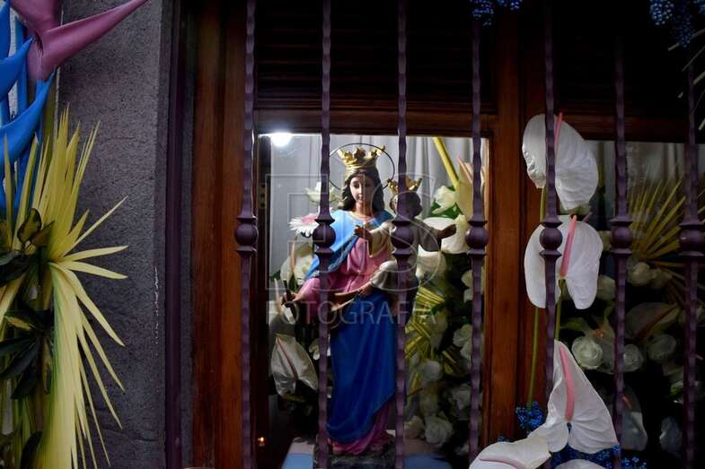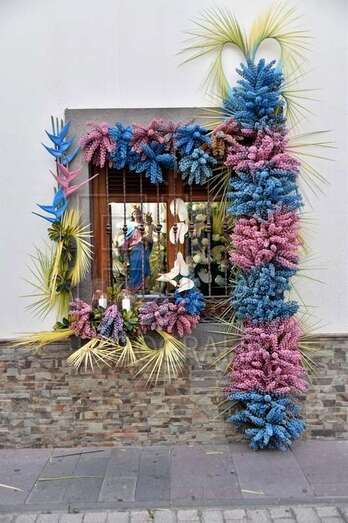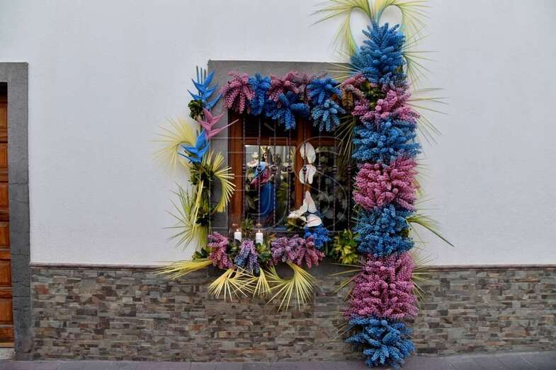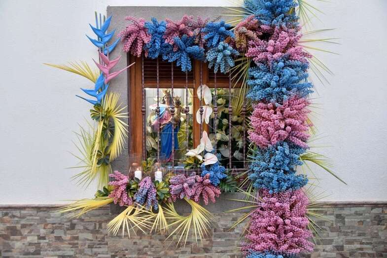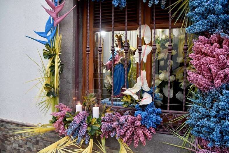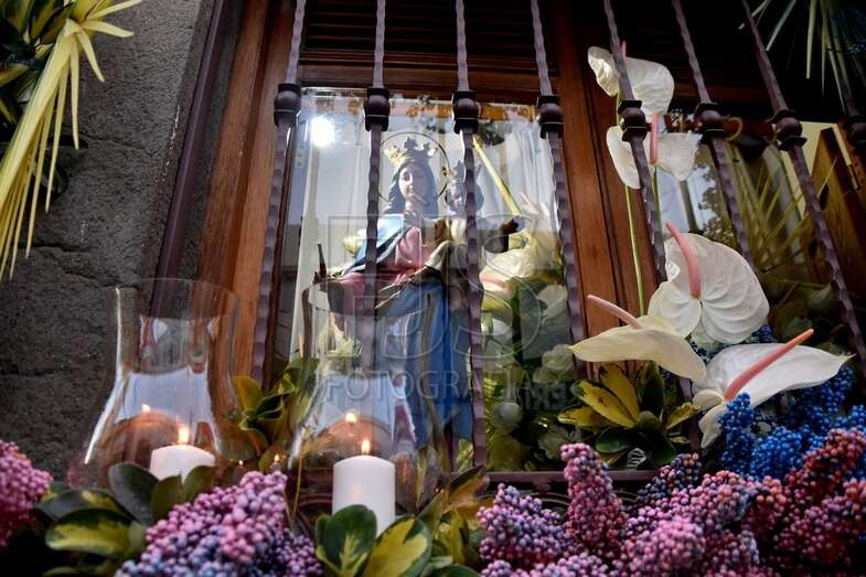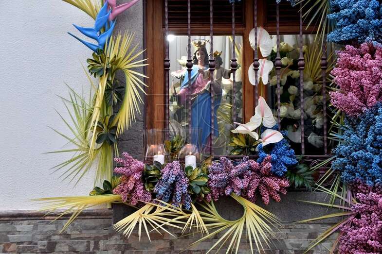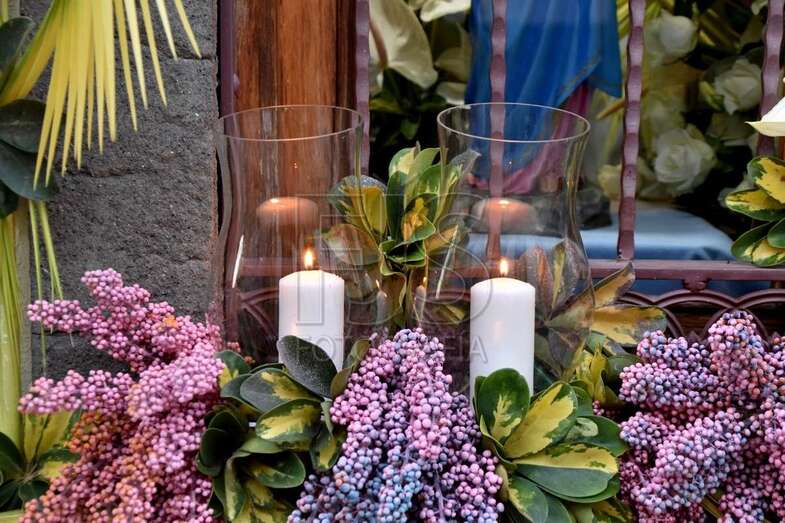 Para tal fin, en este domingo festivo, la imagen ha amanecido vestida de gala, adornada con un arco de semillas de Cheflera, compuesto por heliconia psittacorum, hojas de anthurium, y a sus pies dos velas encendidas para pedirle su protección.