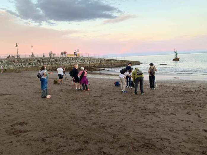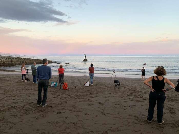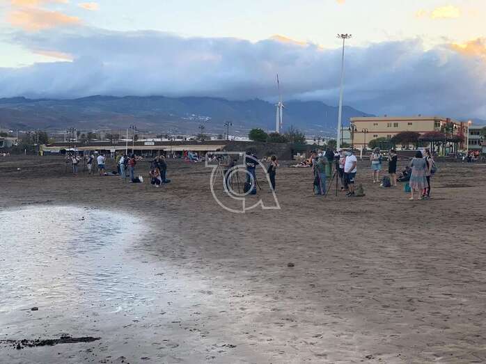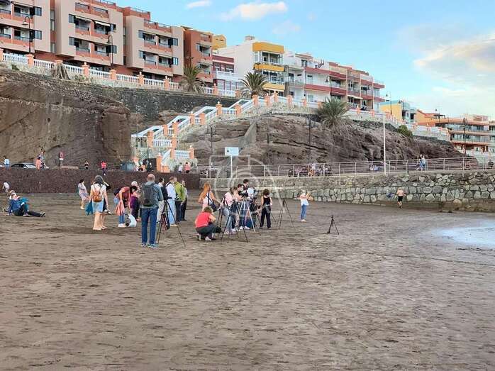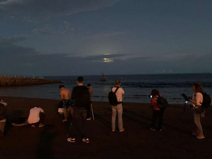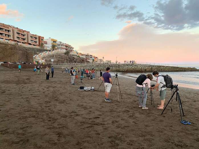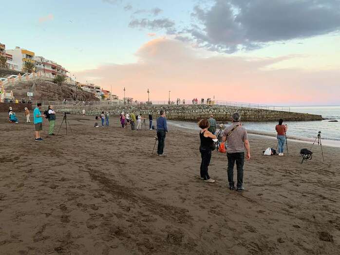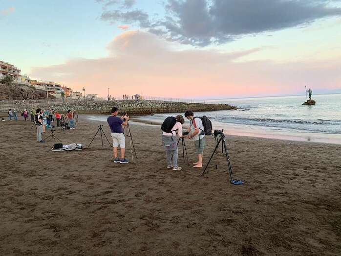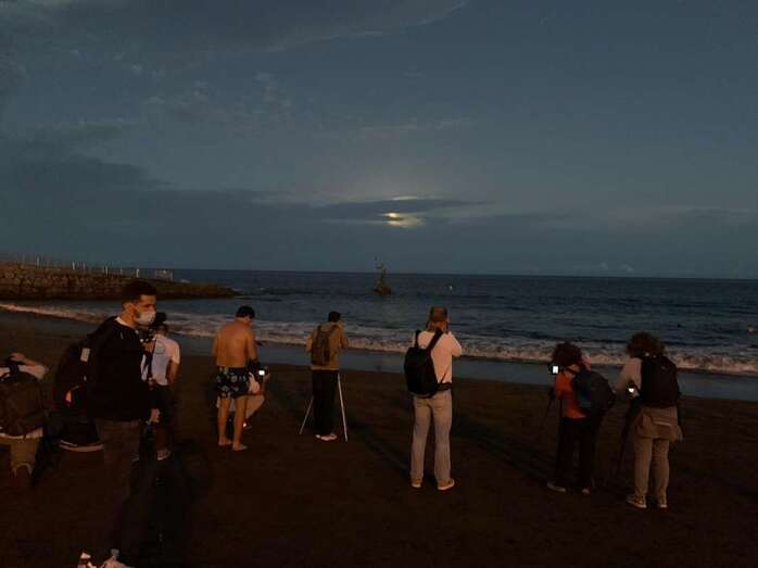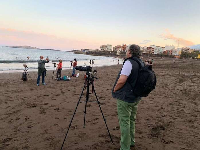Un grupo de fotógrafos se dan cita en la playa de Melenara para captar la imagen de salida del satélite de la Tierra