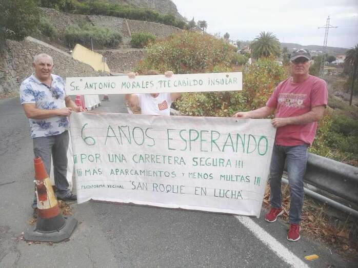 Tratando de respetar las normas y la distancia social en lo posible, un reducido grupo de vecinos en representación de la plataforma vecinal San Roque en lucha han decidido que, después de 6 años de espera por la reparación del muro que sostiene uno de los márgenes de la carretera general, es hora de hacer llegar la queja a la presidencia del Cabildo Insular como responsable de este inexplicable abandono.