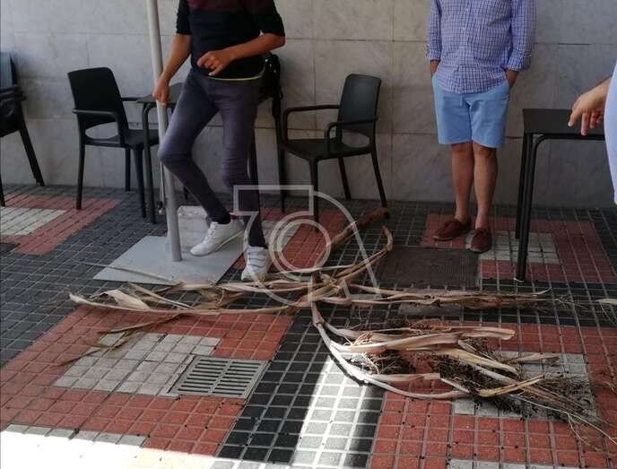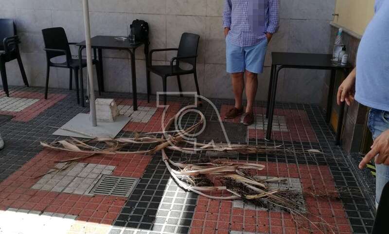 “Estas palmeras nos están haciendo la vida imposible a los locales que estamos aquí. Hoy cayó una hoja a dos personas que estaban saliendo de la cafetería y cualquier día esto va a ocasionar un gran problema porque se desploman a una velocidad increible. Días atrás le cayó otra a una clienta entrando a la peluquería”, se quejan los empresarios que regentan estos negocios.