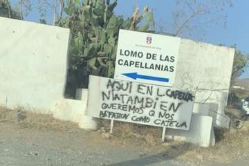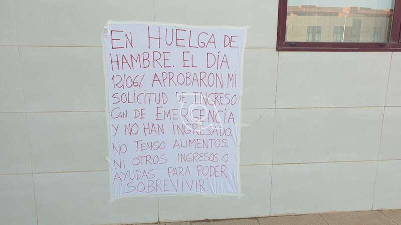 Mari Carmen Santana Rodríguez, que vive en el sector de Las Jardineras, se plantó con sus bártulos a las 16.30 horas en uno de los bancos situados en el flanco derecho de la puerta principal con el apoyo de una pancarta fijada a la pared en la que explica que ha tomado la decisión de declararse en huelga de hambre porque lleva esperando desde el 12 de junio por el abono del Ingreso Canario de Emergencia que le fue aprobado en esa fecha, tras haberlo solicitado formalmente un mes antes.
