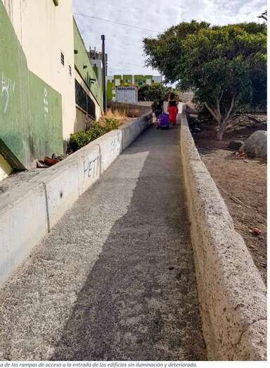 ¿Hace cuántos años se edificaron estos edificios? Pues desde entonces nadie asume que hay necesidades de atención a las personas que no pueden subir escaleras para llegar a sus casas, y para ello tienen que recorrer, desde donde aparcan sus coches o desde la parada de guaguas a su portal, más de 300 metros ya que sólo existe una rampa en la escalera central y otra en uno de los edificios al final de la calle, sin mencionar las necesidades de urgencias de ambulancias y bomberos, y no sólo eso, sino que tienen que hacerlo prácticamente a ciegas ya que la iluminación en rampas y pasillos es prácticamente inexistente, transmitiendo una sensación de completo abandono. ¿Es mucho pedir que de una vez se solucionen los accesos y se facilite la luz a estos vecinos?