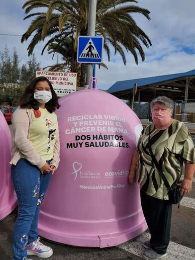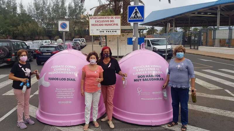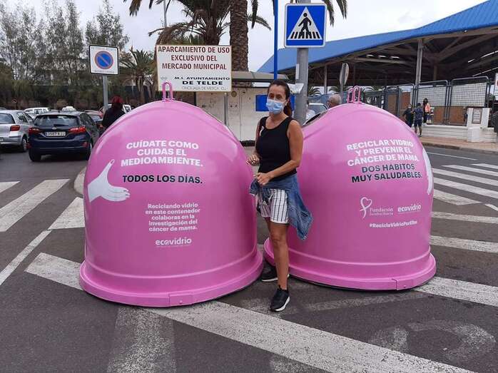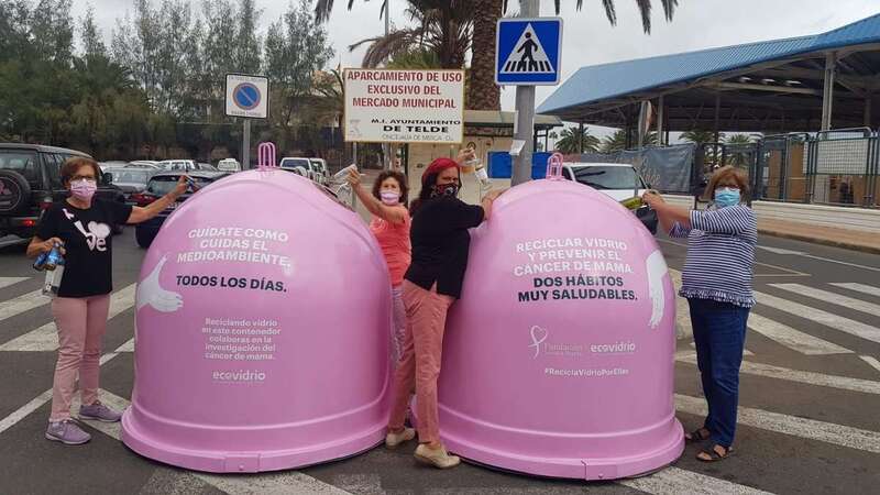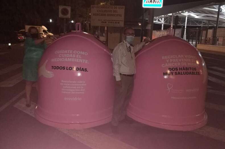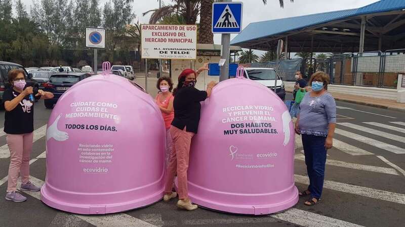 El colectivo vecinal anima a los teldenses a depositar los envases de vidrio en los iglús rosas colocados cerca del Mercado Municipal con motivo del Día Mundial contra el Cáncer de Mama