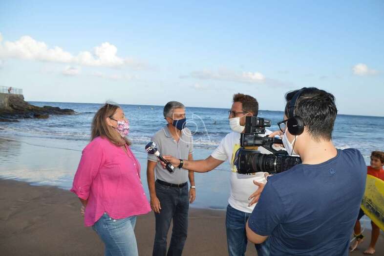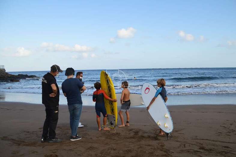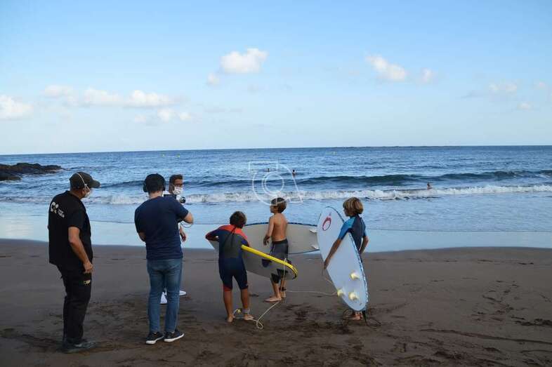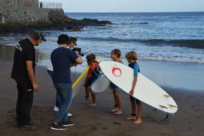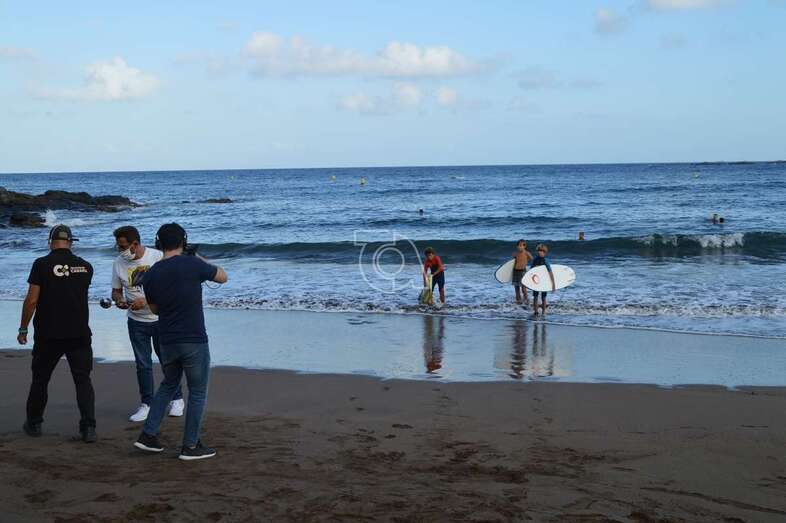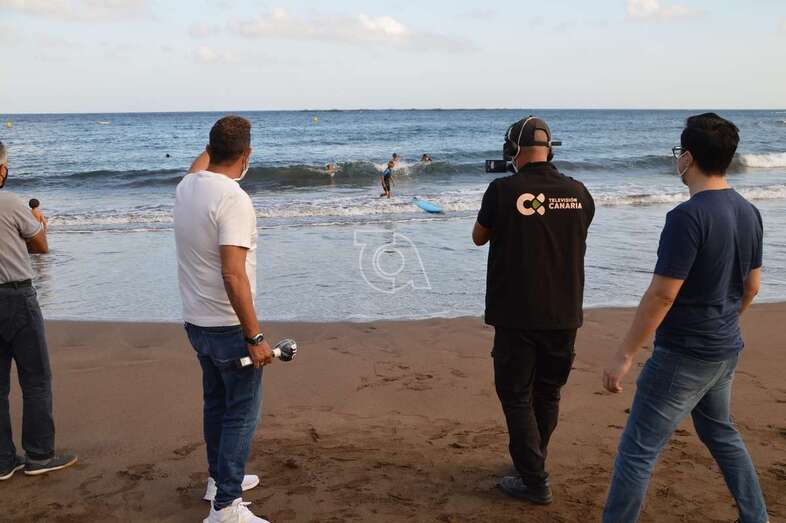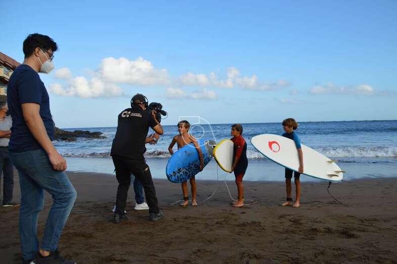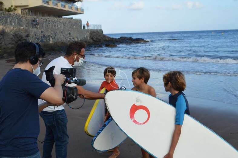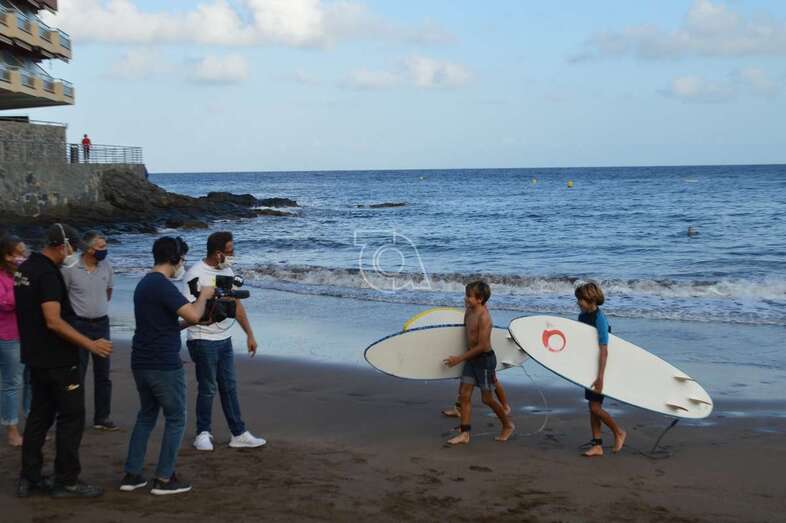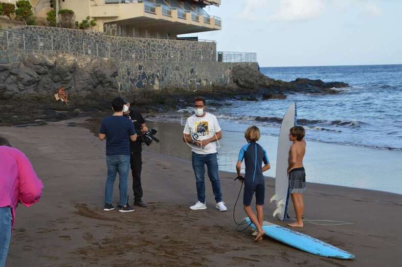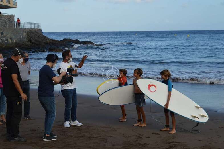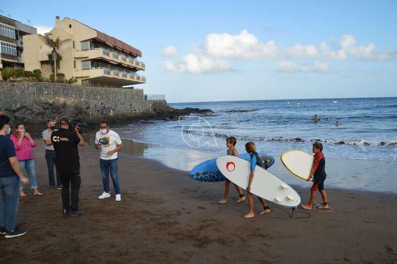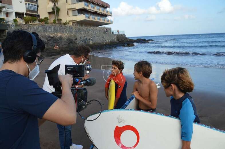 Un equipo del programa Buenas Tardes Canarias graba las impresiones que de los chicos surferos que prestaron auxilio el pasado sábado a personas mayores que pasaban apuros en el mar debido al fuerte oleaje