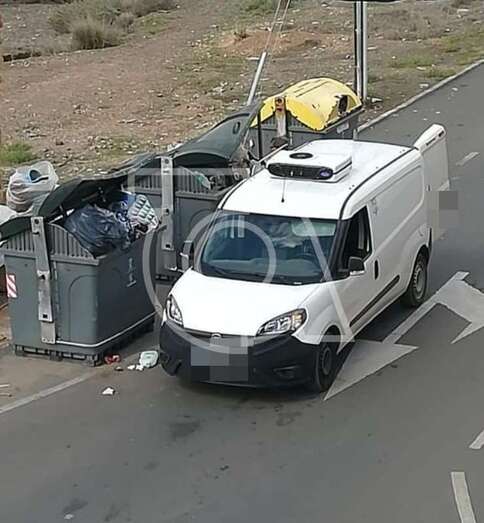 Telde.- Una furgoneta de color blanco descarga cajas de pollo que chorrean sangre fuera y dentro de los contenedores que están en la calle de Bentaguayre, en el sector de Caserones Altos (Telde).
