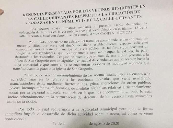 Y es que aseguran que el local La Cañita Tropical, antiguo Bar Fregoli, ha instalado una terraza con mesas y sillas que ocupa la práctica totalidad de la acera, de manera que para pasar los viandantes se ven obligados a invadir la calzada. "Téngase en cuenta que se trata de una arteria próxima a la plaza de San Gregorio y con un significativo caudal de viandantes que se acercan hasta la zona comercial y que entre ellos se encuentran personas de movilidad reducida", advierten en el documento remitido al Consistorio.