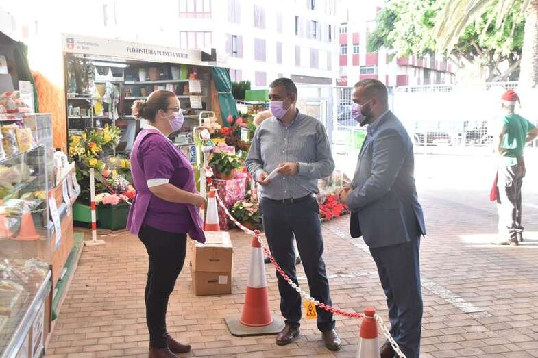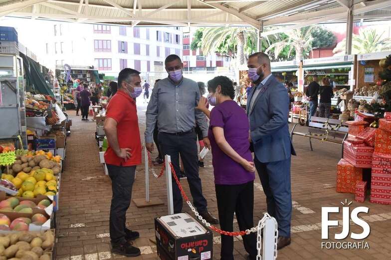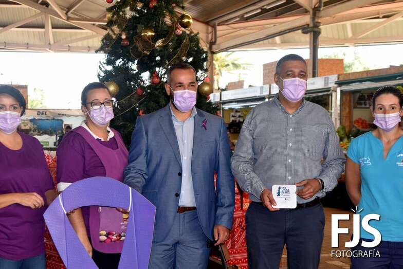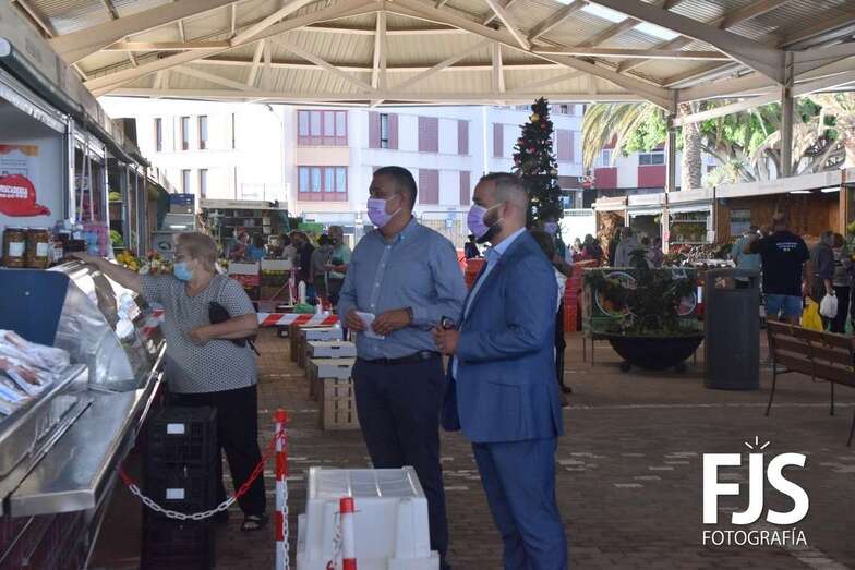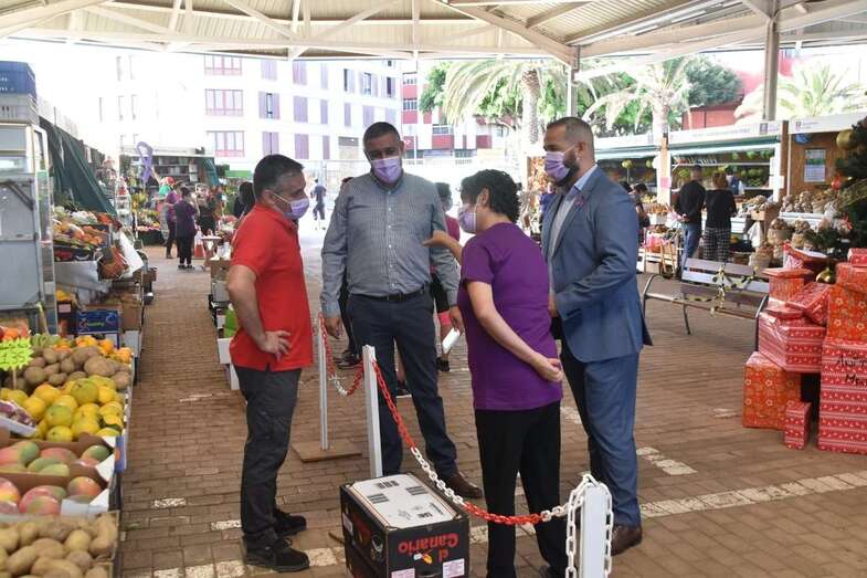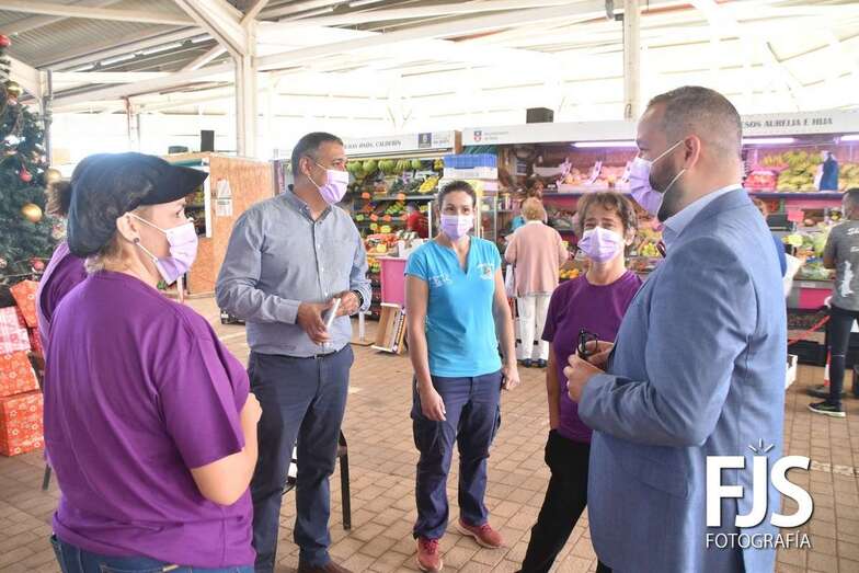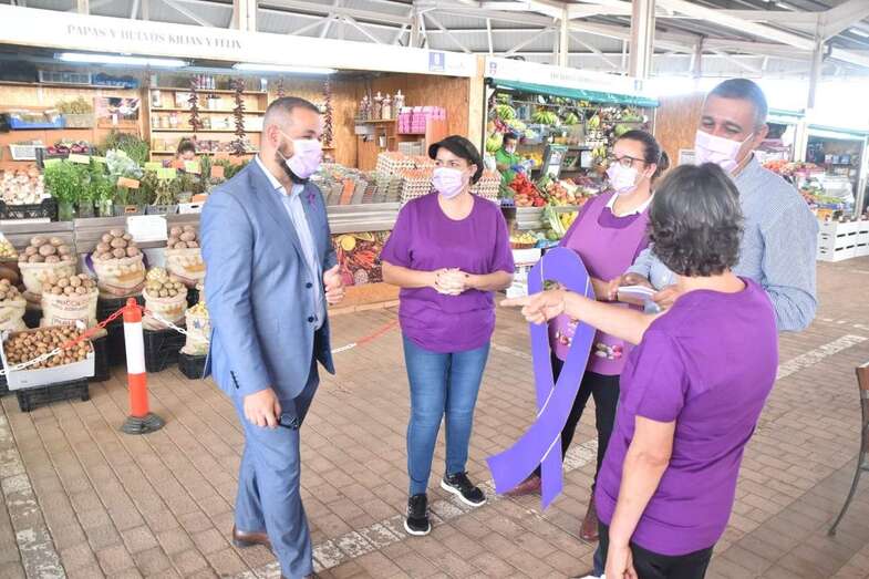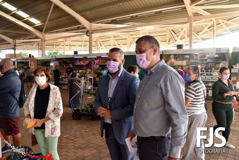 Hasta el recinto de Nara se acercaron los concejales de Mercados y Políticas de Igualdad, Servando González y Jonay López, respectivamente; quienes luciendo también mascarillas del tono que simboliza la lucha contra la violencia machista recorrieron las instalaciones saludando a los comerciantes.