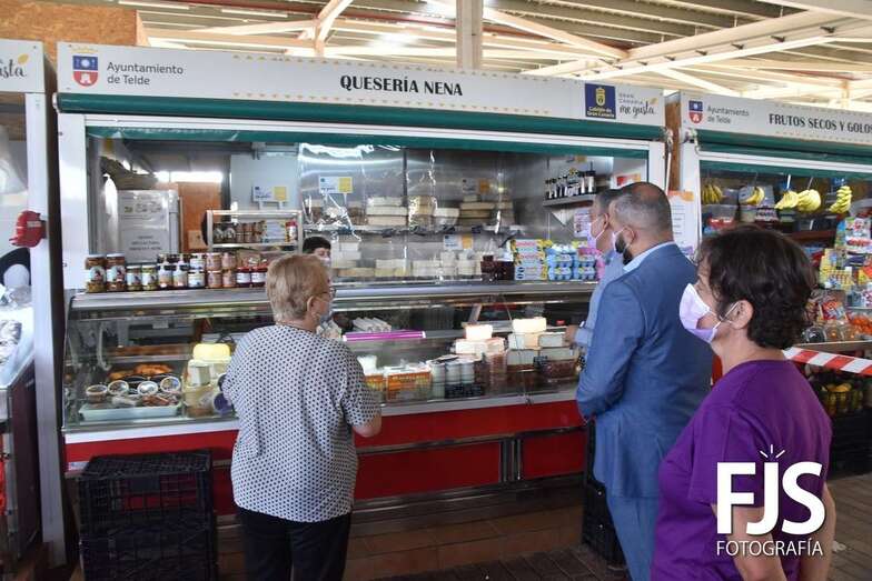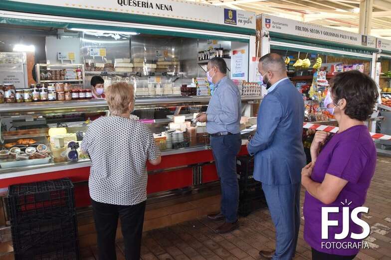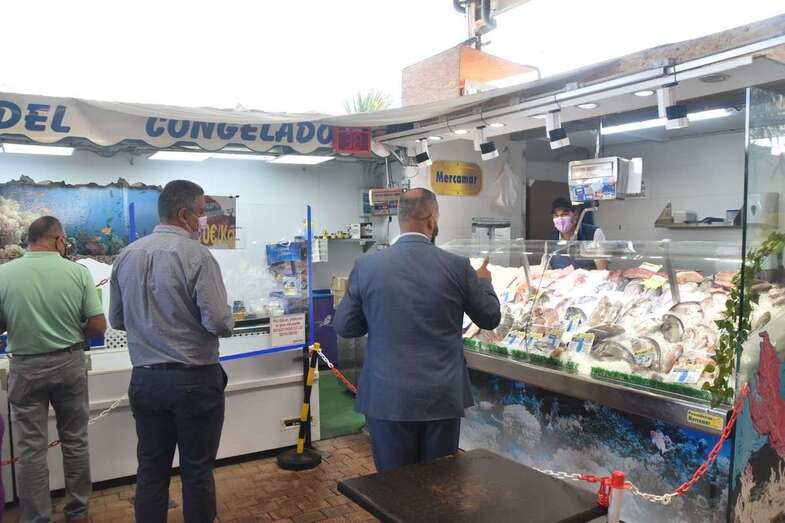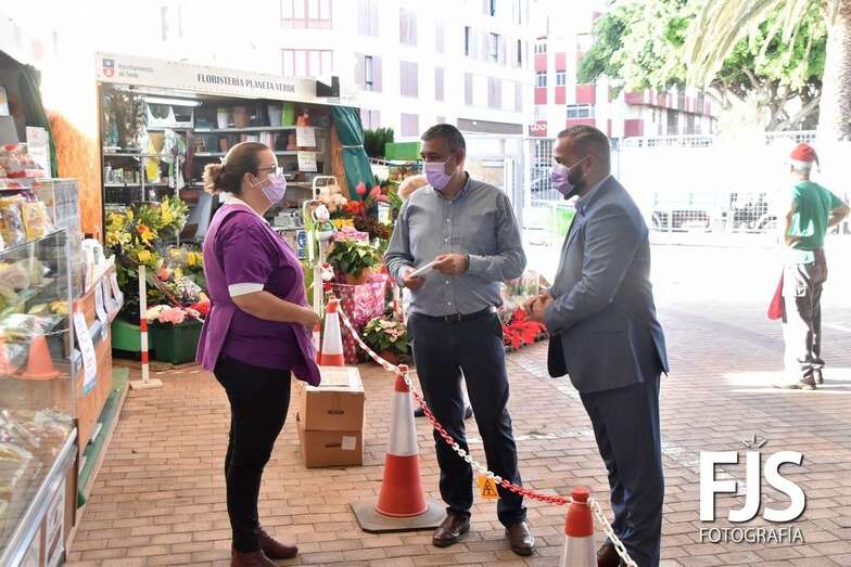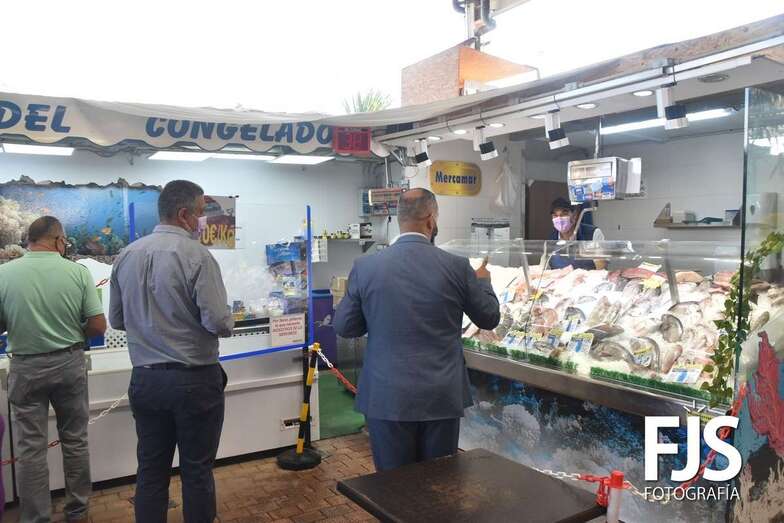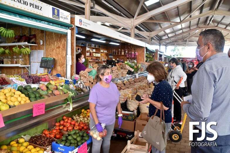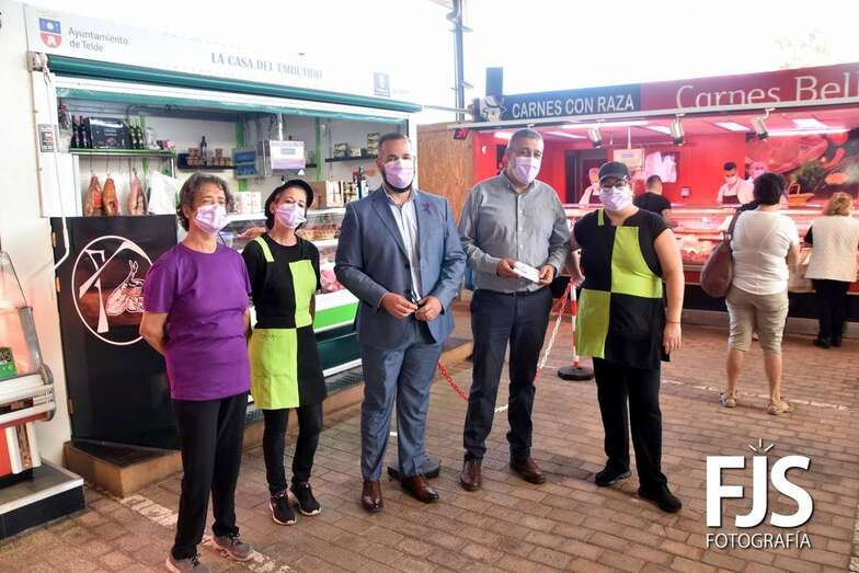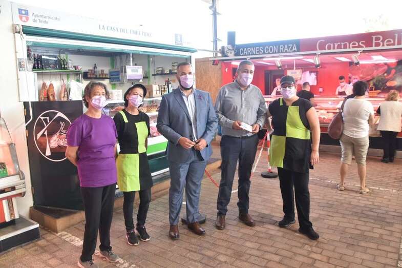 Hasta el recinto de Nara se acercaron los concejales de Mercados y Políticas de Igualdad, Servando González y Jonay López, respectivamente; quienes luciendo también mascarillas del tono que simboliza la lucha contra la violencia machista recorrieron las instalaciones saludando a los comerciantes.