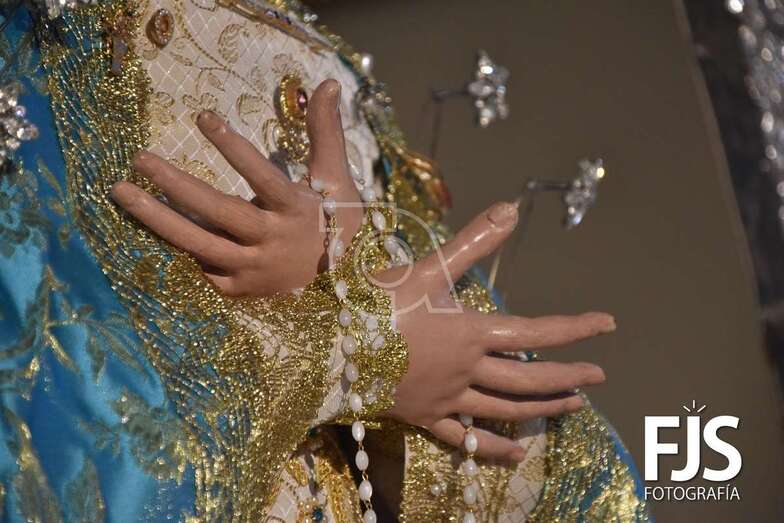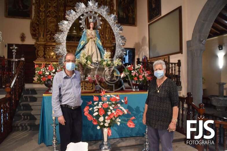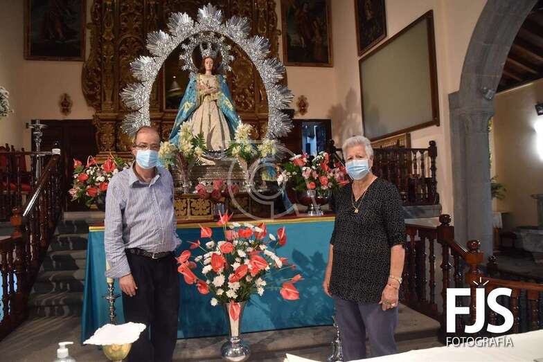 La imagen de la Virgen era engalanada esta mañana por un grupo de voluntarios de la parroquia que tutela el sacerdote Ricardo Medina bajo la coordinación del sacristán Antonio Rivero García. La bella efigie, que fue bajada ayer desde la hornacina donde permanece todo el año en un acto celebrado a puerta cerrada, será venerada en el altar mayor detrás de la mesa de celebraciones. Allí permanecerá hasta el próximo 20 de diciembre.