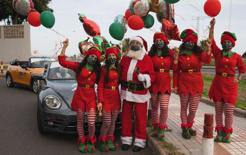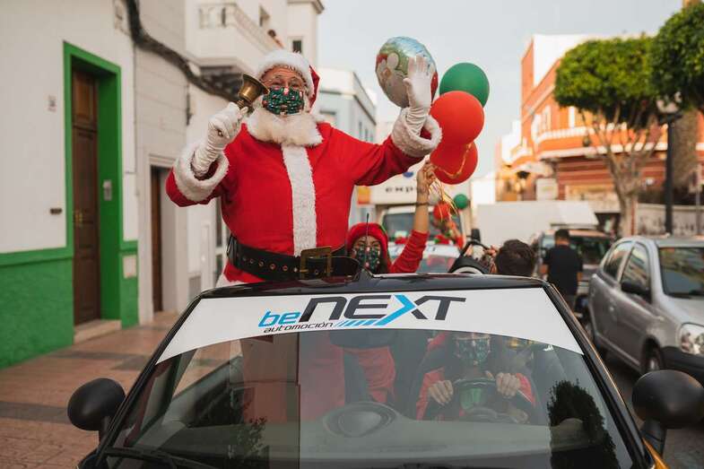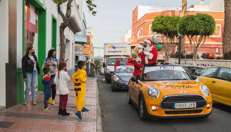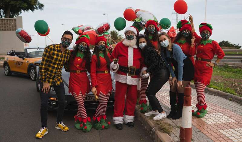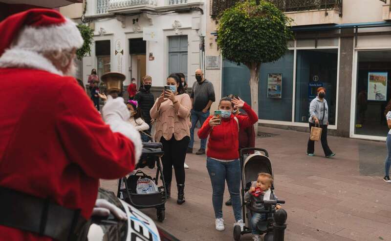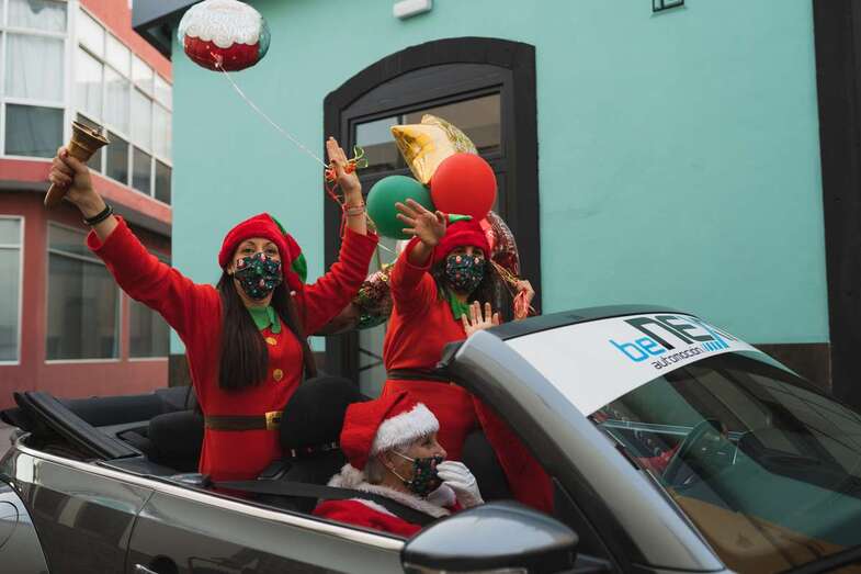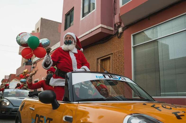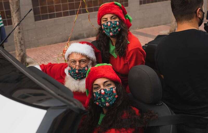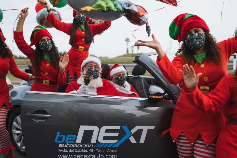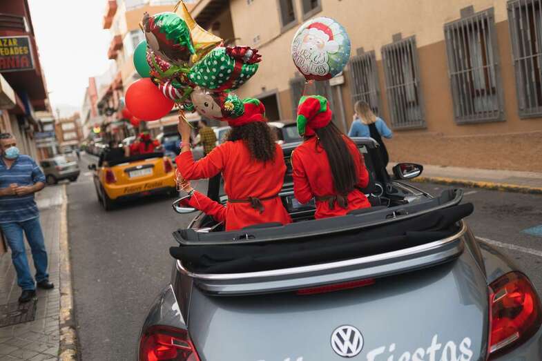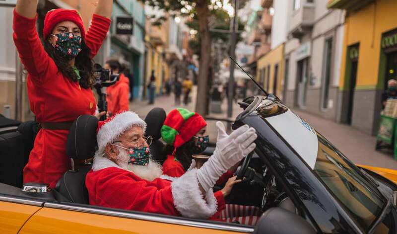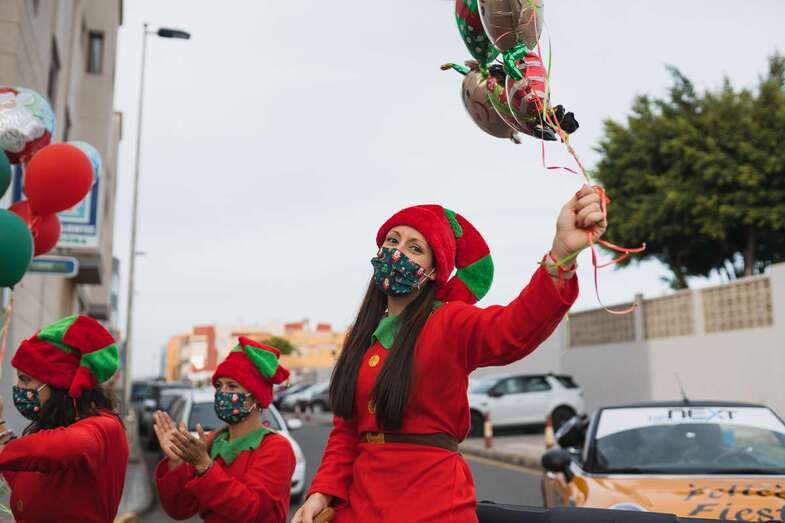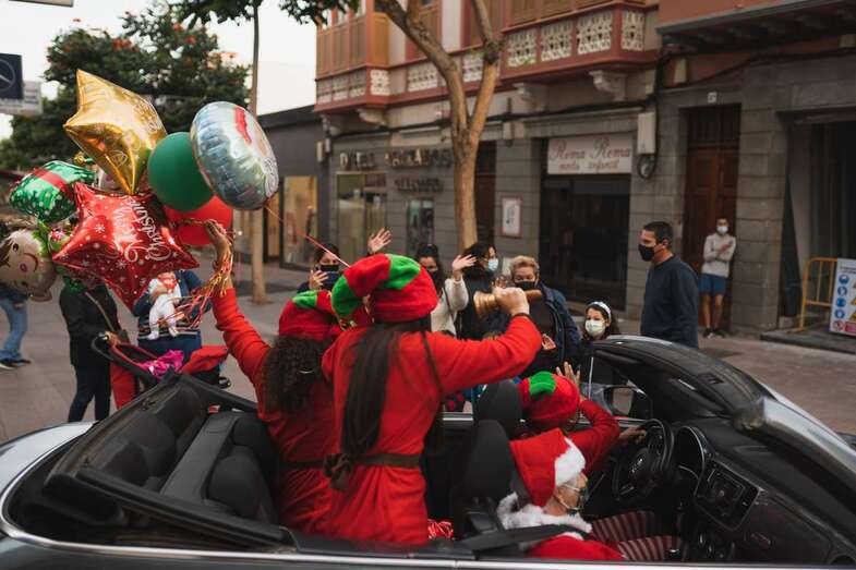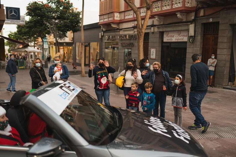 El paseo en coche del gordinflón de traje rojo y de sus elfos se anunció días atrás por la Concejalía de Desarrollo Local que tuela la edila Lidia Mejías, pero sin desvelar ni el día ni la hora para evitar aglomeraciones de personas en las vías de Telde, aun así fueron cientos los menores teldenses que salieron a la calle a saludar y solicitar sus deseos de regalo y buena nueva para el próximo año después de unos duros meses de pandemia.