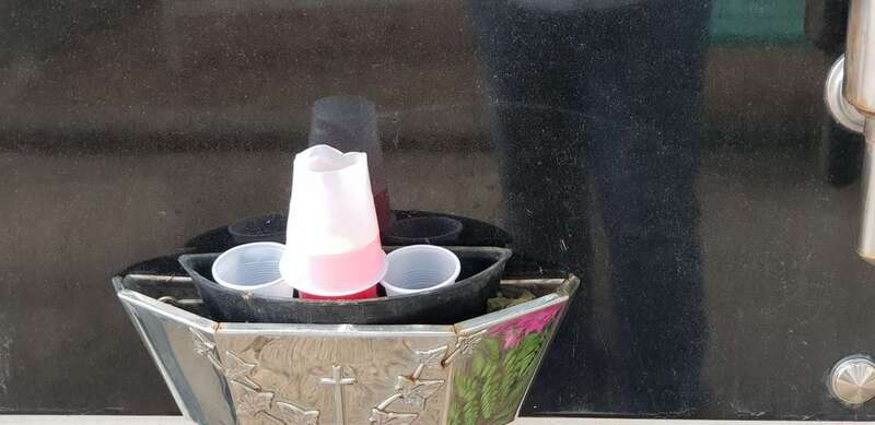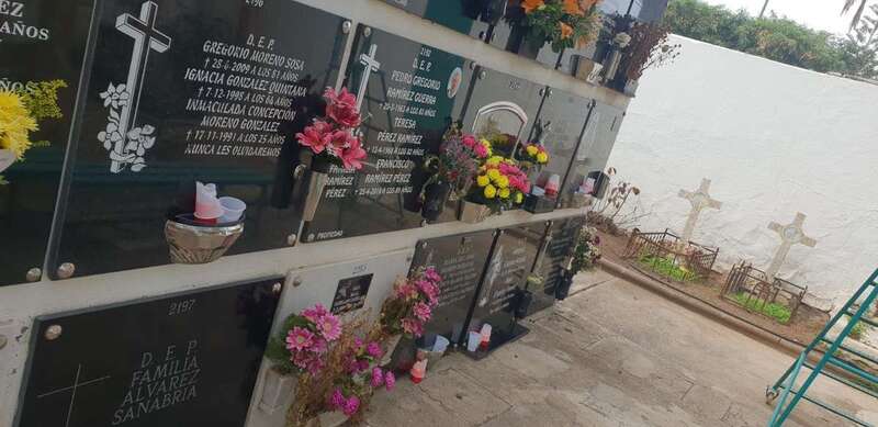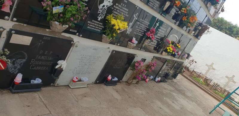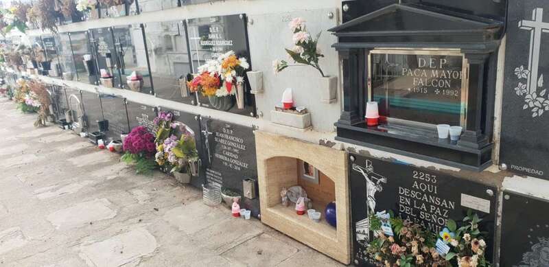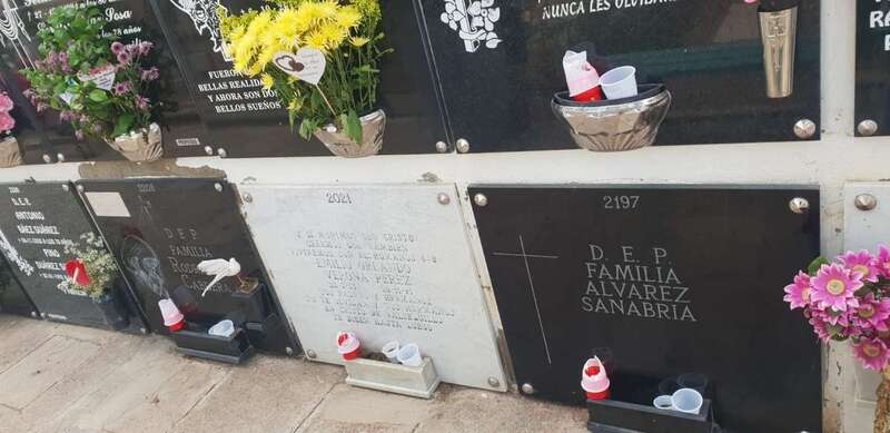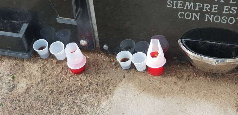 Depositan vasos con líquidos junto a los nichos del cementerio de San Juan