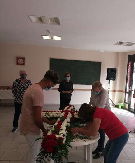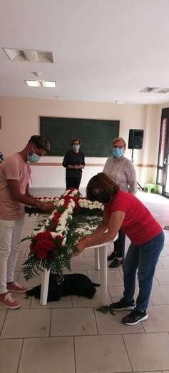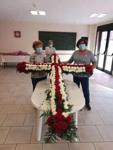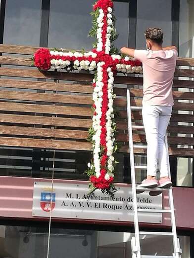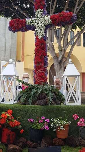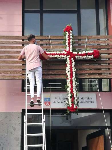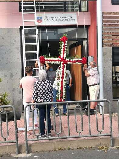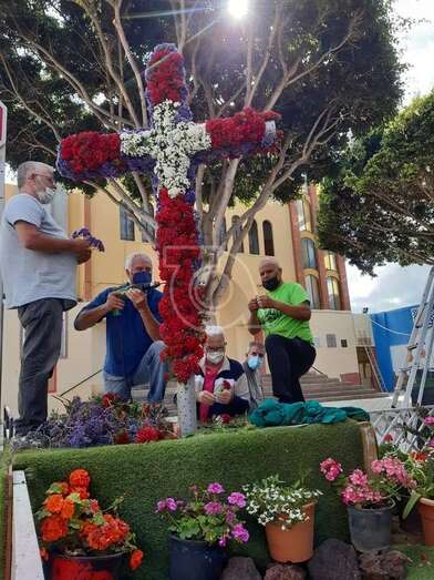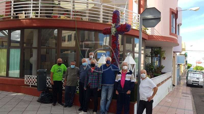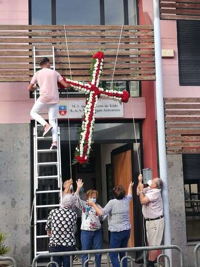 Uno de los colectivos que no deja pasar por alto esta celebración religiosa es el Roque Azucarero. Este sábado un grupo de socios enramaron una gran cruz que luego izaron a la fachada principal de la sede social situada en la calle de El Roque de Los Llanos, respetándose en todo momento las medidas sanitarias exigidas por las autoridades.