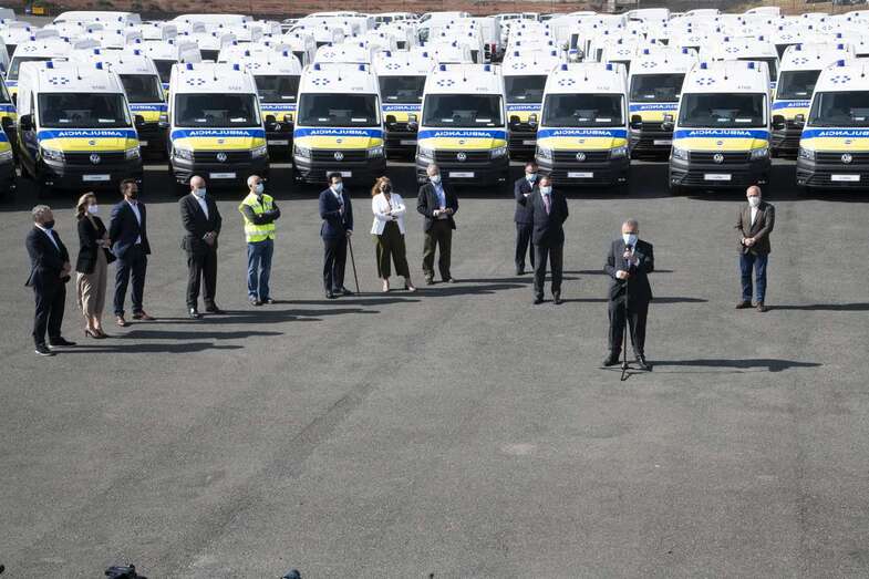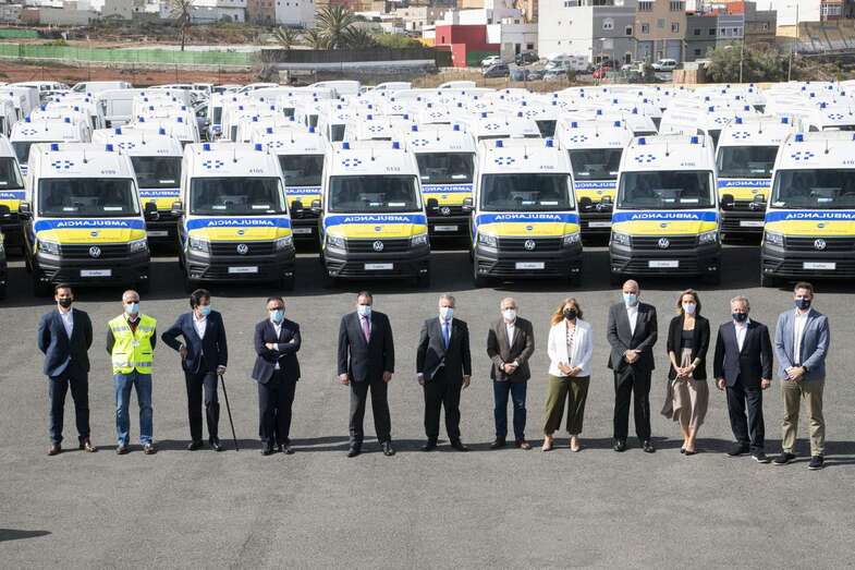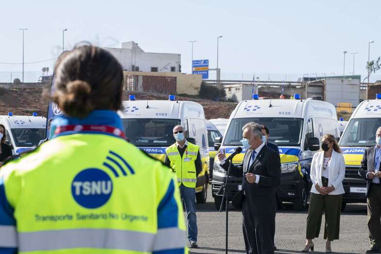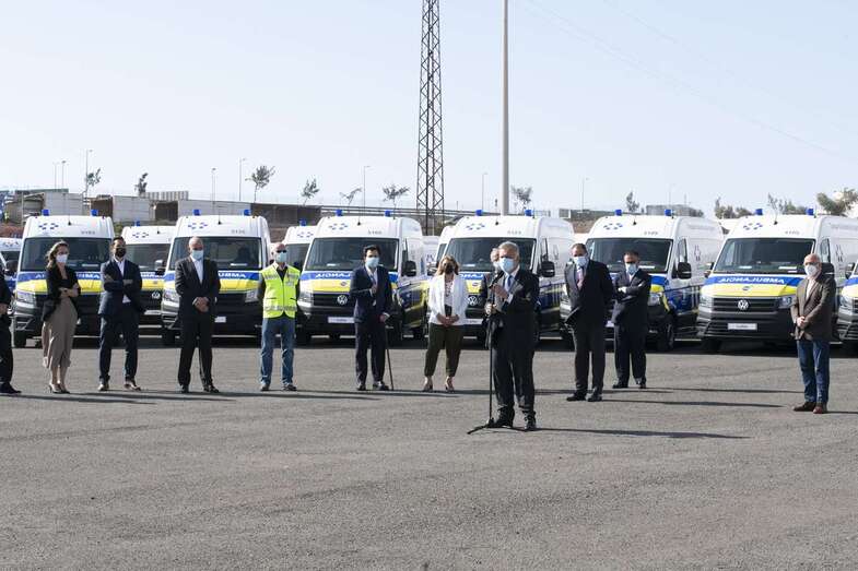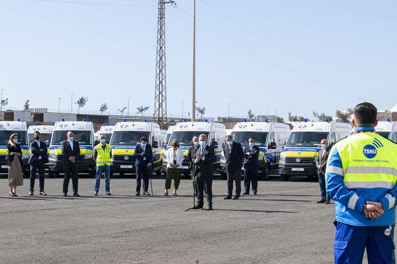Telde.- El presidente de Canarias, Ángel Víctor Torres, junto al consejero de Sanidad, Blas Trujillo, presentó este martes en Telde la nueva flota de ambulancias del Transporte Sanitario No Urgente (TSNU) para la isla de Gran Canaria, que supone la renovación de todos los recursos y un incremento de unidades del 9%, pasando de 102 a 111 recursos.