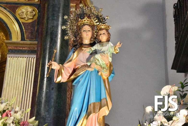 Talla de la Virgen de María Auxiliadora bellamente engalanada por Segundo Amador/Francisco Javier Santana. Talla de la Virgen de María Auxiliadora bellamente engalanada por Segundo Amador/Francisco Javier Santana.