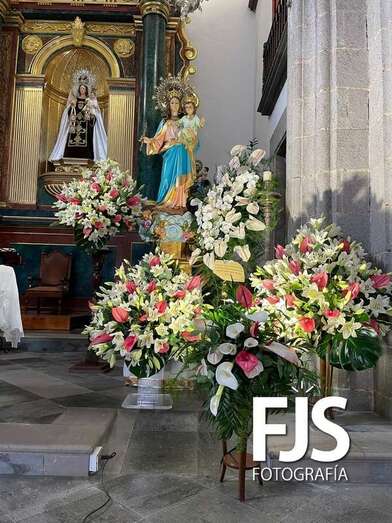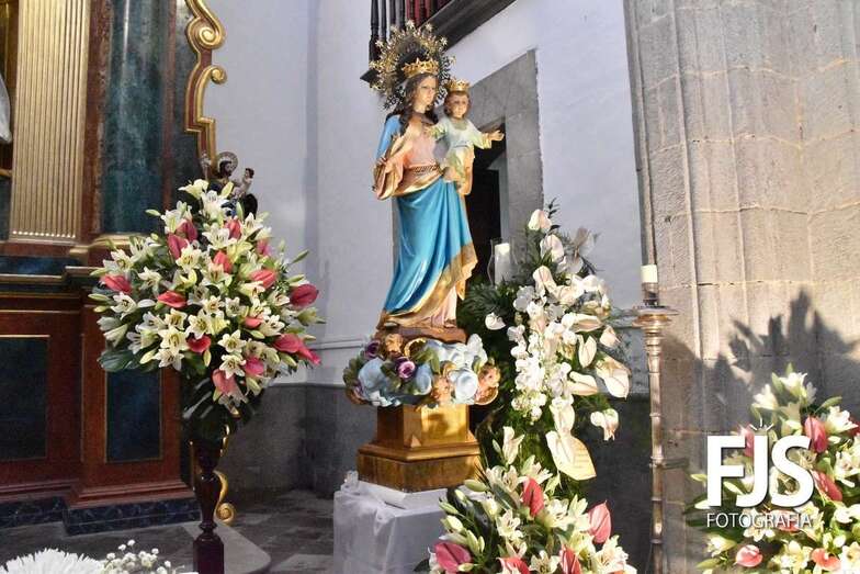 La imagen de la virgen ha sido trasladada estos días desde el colegio, epicentro de la actividad salesiana en el municipio, hasta la iglesia de Los Llanos. En su día grande, la talla religiosa está adornada por el arte floral de Segundo Amador, que cuidadosamente ha enlazado anthurium rosados, gladiolos blancos y hojas de eucaliptos y filodendros.