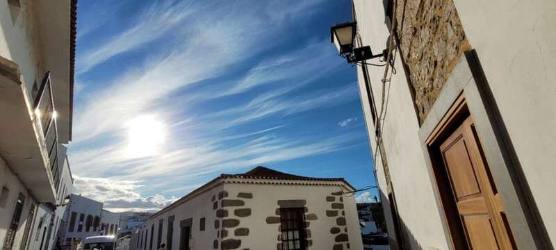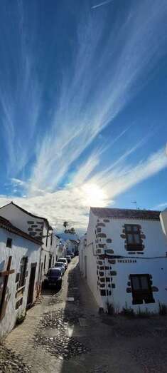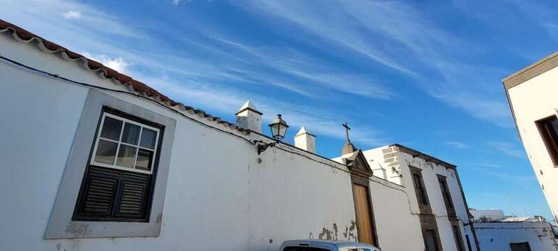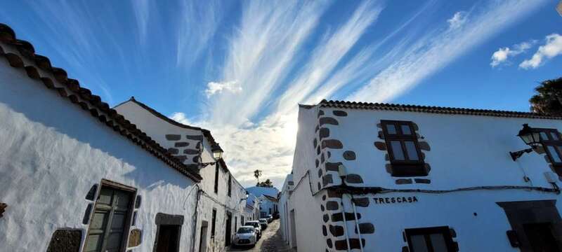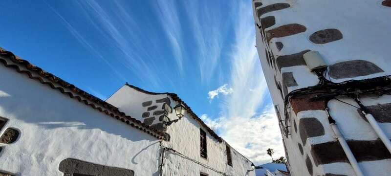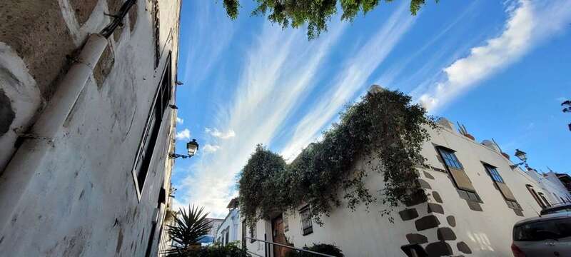 Con el crepúsculo en sus últimas luces y aún los mínimos rayos de sol iluminando tejados, perfiles urbanos y rurales, contra el blanco de las fachadas de casas de estilo canario, con un cielo jaspeado de caprichosas formaciones que de oeste a este se desplazan con la lentitud y calma, quizás para mejor ser observadas, inspiradas por su gran creador, nuestra naturaleza que me inspira la reflexión de que no hay día que sobre mis pasos, me sorprenda la belleza y misterio de nuestra naturaleza isleña atlántica de Gran Canaria.