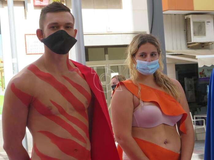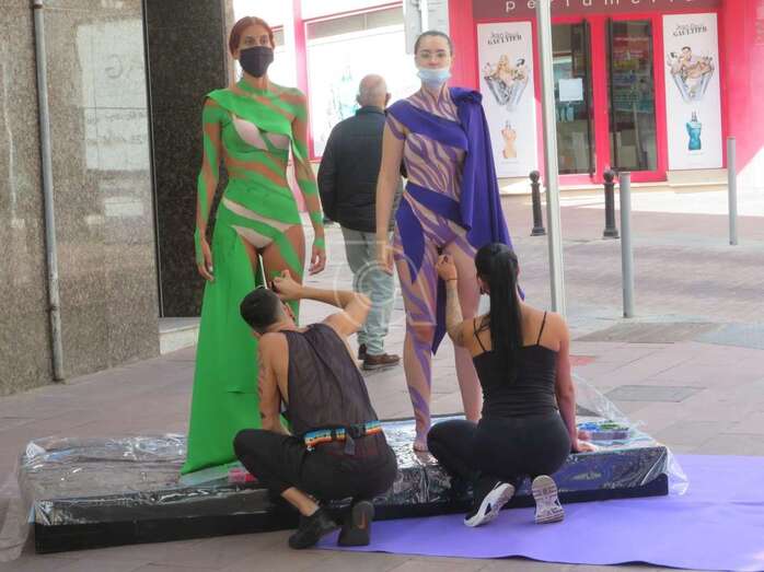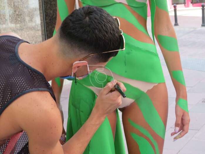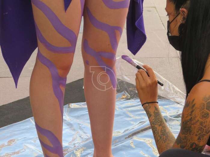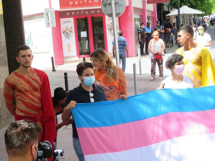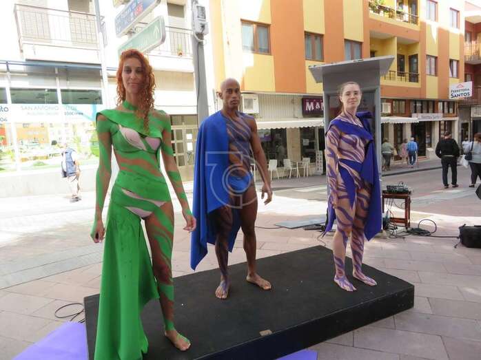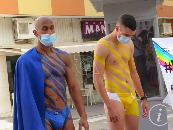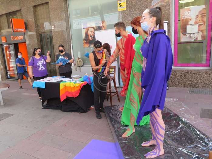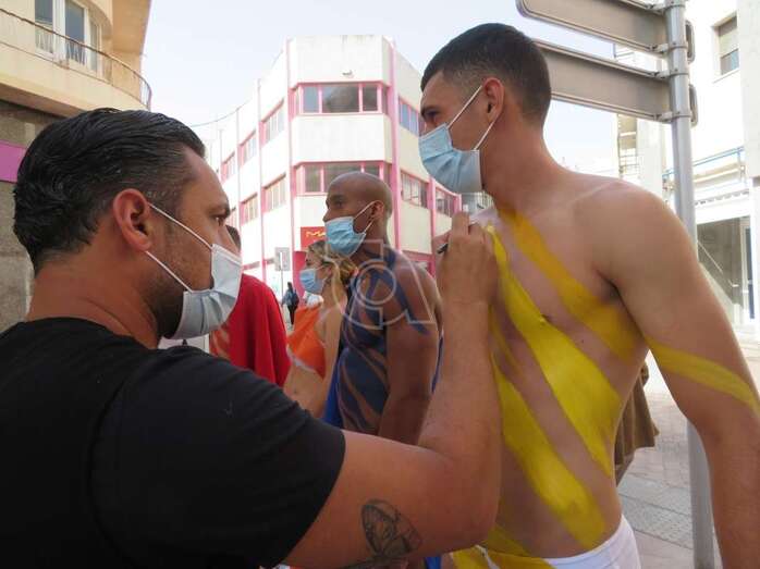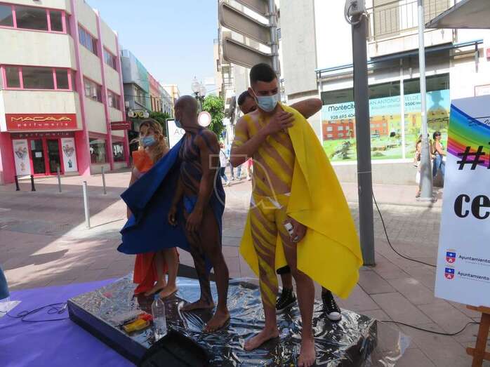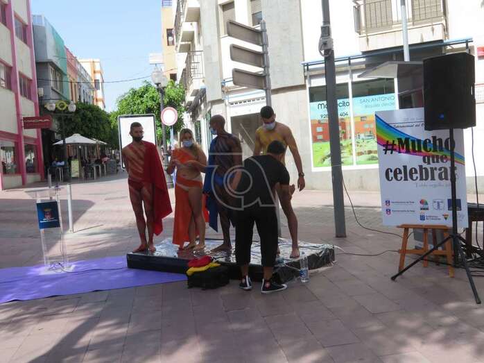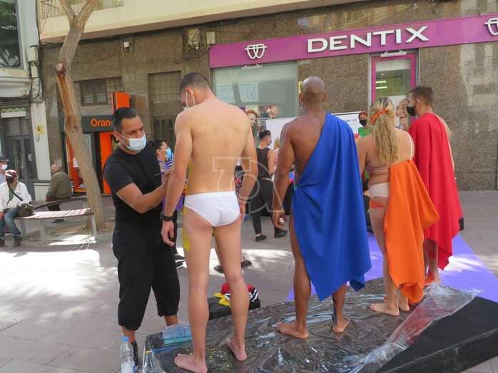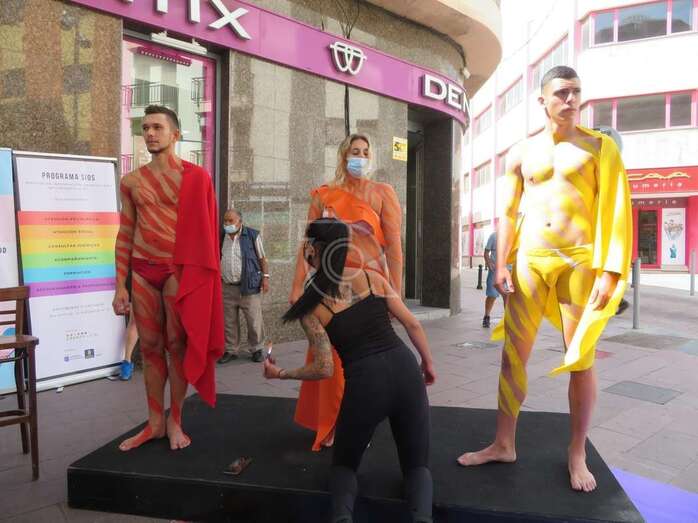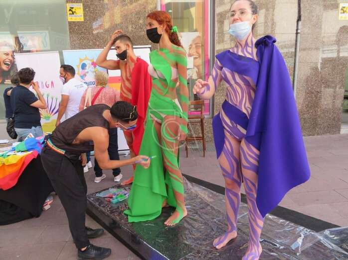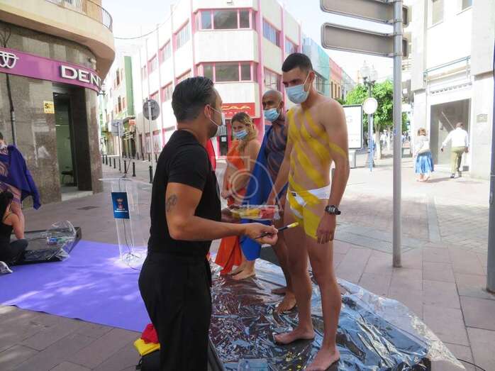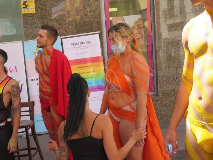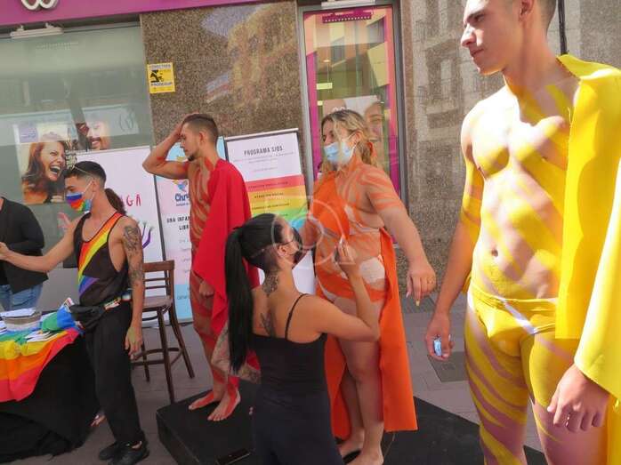 La jornada reivindicativa comenzó a las 10.00 horas en el mismo emplazamiento con la colocación por los colectivos de un puesto informativo y contó con una performance del artista teldense Nauzet Alfonso en la que, a través de la técnica de pintura corporal, se reflejó en seis modelos los colores del arcoíris a través de un diseño artístico evocando la libertad y defensa de los derechos del colectivo.