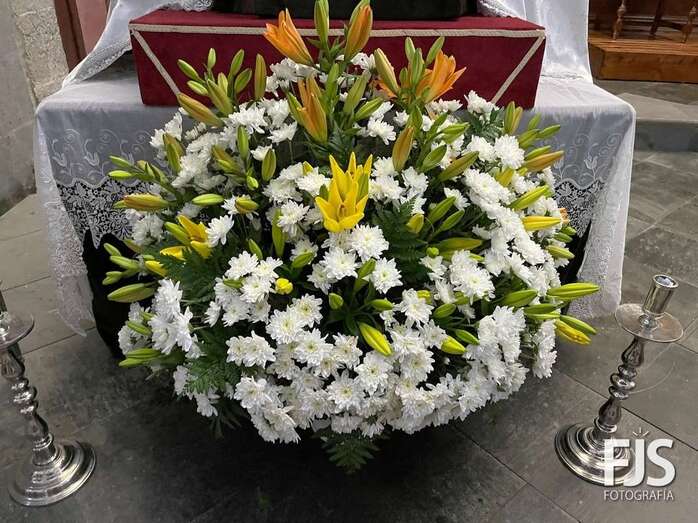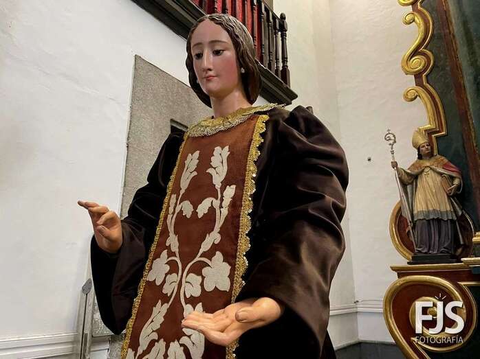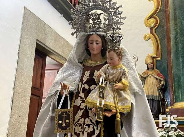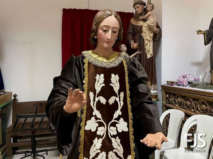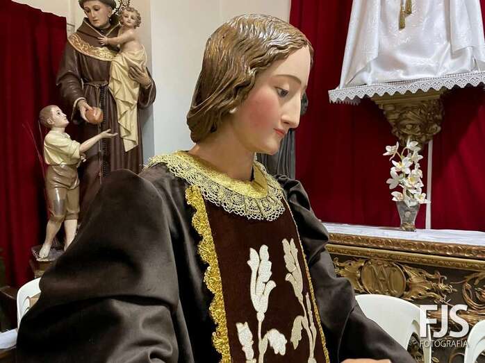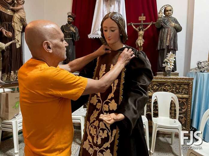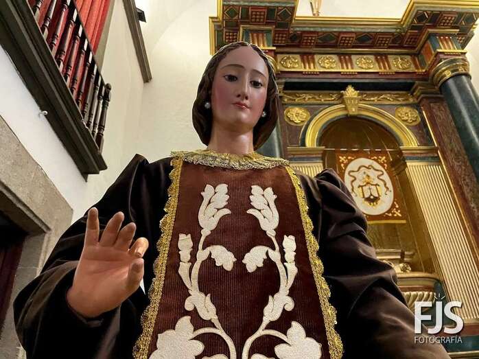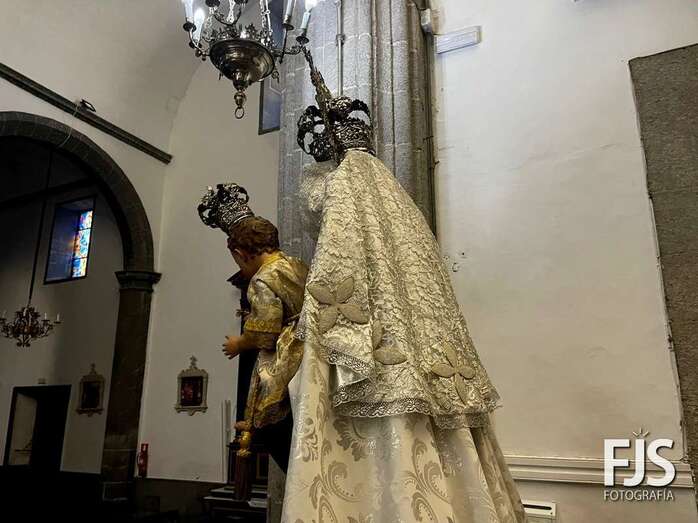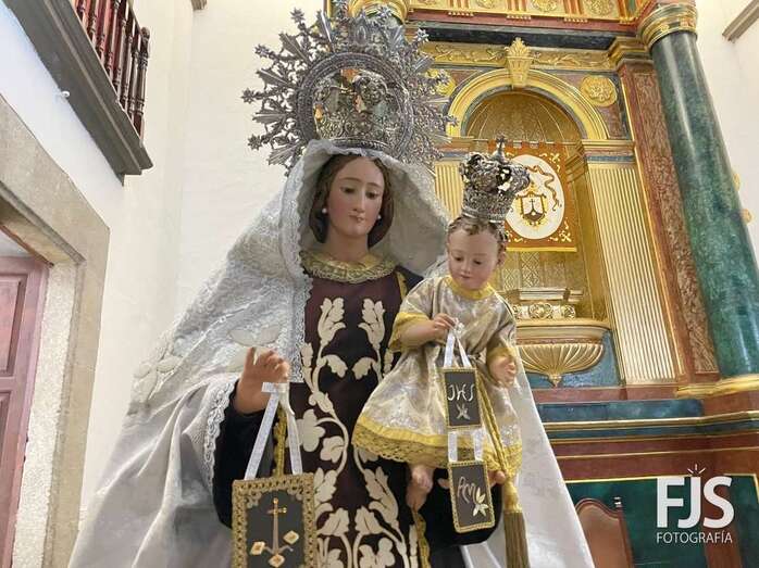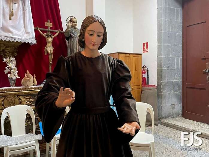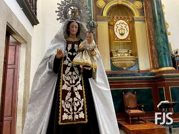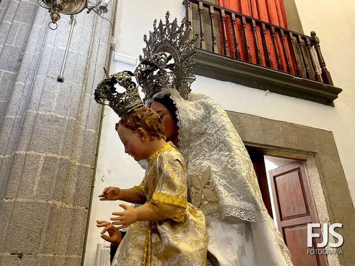 La venerada imagen de la Virgen del Carmen estrena este año traje, donado por varios vecinos de Los Llanos, y manto confeccionado por el diseñador teldense Segundo Amador, quien también ha realizado el arreglo floral de la escultura.
