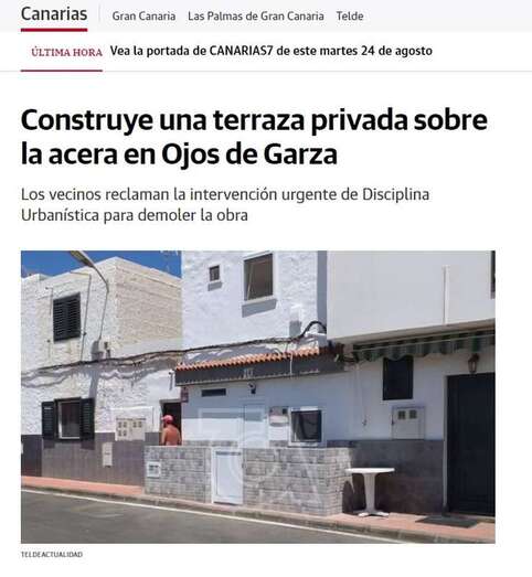 Con el titular Construye una terraza privada sobre la acera en Ojos de Garza” y con el subtítulo “Los vecinos reclaman la intervención urgente de Disciplina Urbanística para demoler la obra”, Canarias7 abre la información publica en su edición digital y cuyo contenido íntegro es el siguiente:
