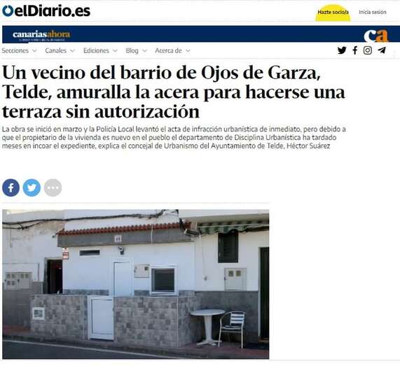 Con un contenido más extenso y explicativo, CanariasAhora rompe con el titular “Un vecino del barrio de Ojos de Garza, Telde, amuralla la acera para hacerse una terraza sin autorización”, a lo que acompaña en el subtítulo señalando que “la obra se inició en marzo y la Policía Local levantó el acta de infracción urbanística de inmediato, pero debido a que el propietario de la vivienda es nuevo en el pueblo el departamento de Disciplina Urbanística ha tardado meses en incoar el expediente, explica el concejal de Urbanismo del Ayuntamiento de Telde, Héctor Suárez”.
