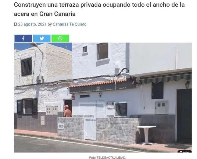 De otro lado, Diario de Avisos, periódico de Tenerife asociado al digital nacional Elespañol, resalta en la sección Canarias te quiero de su edición electrónica que “Construyen una terraza privada ocupando todo el ancho de la acera en Gran Canaria” y el cuerpo de la noticia expone lo siguiente: