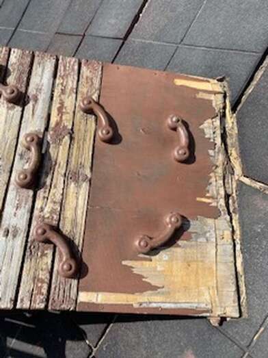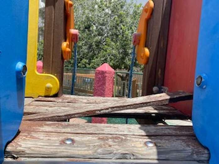 Imagen de una tabla levantada y con clavos asomando en uno de los juegos / TA Imagen de una tabla levantada y con clavos asomando en uno de los juegos / TA