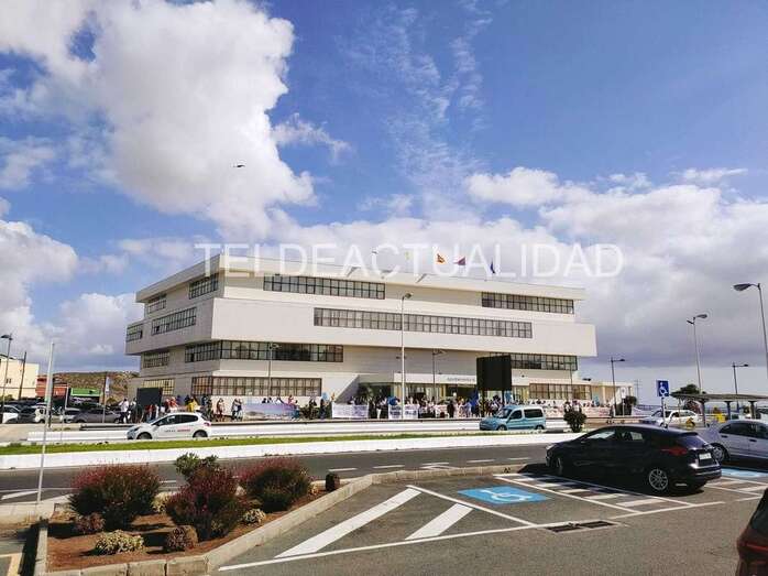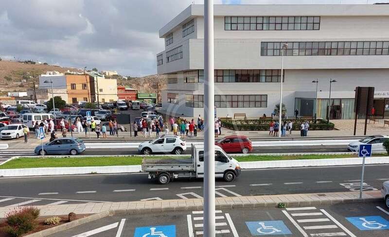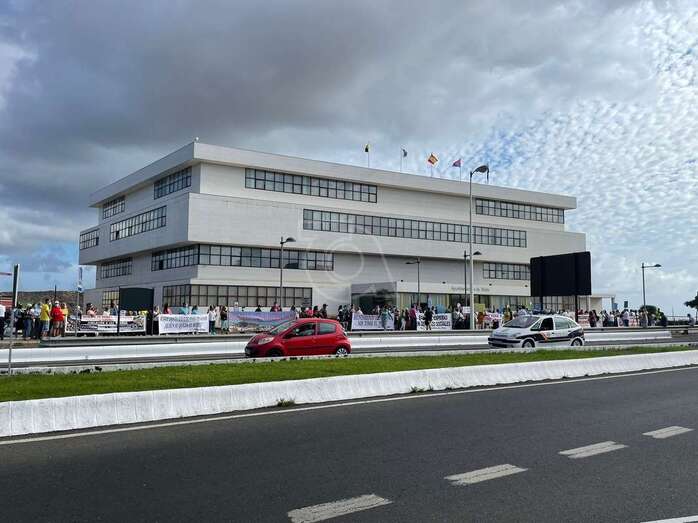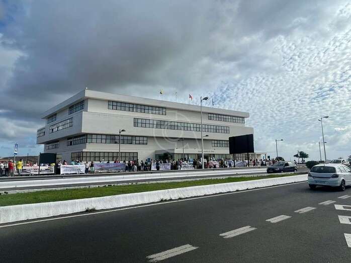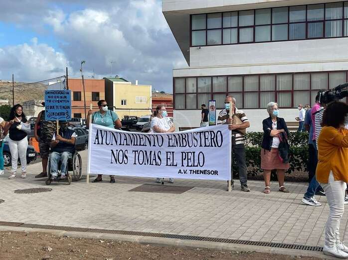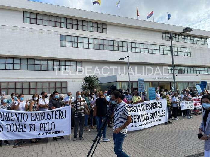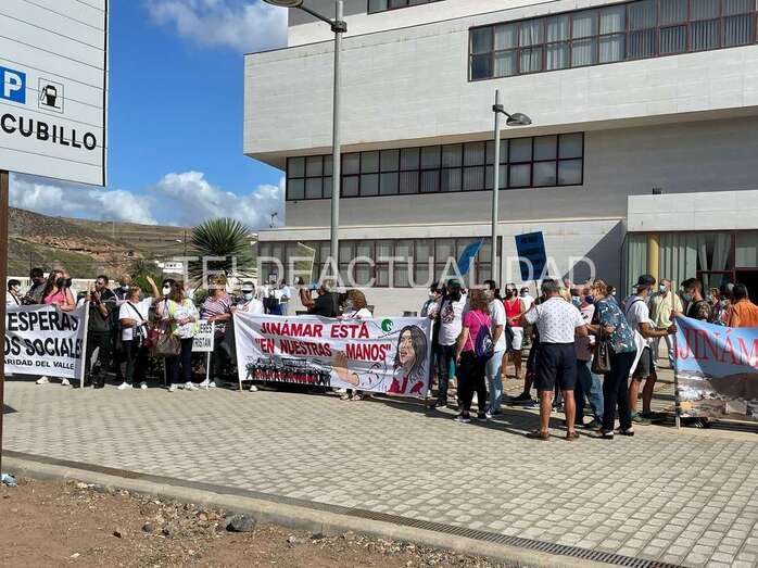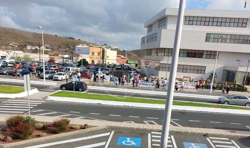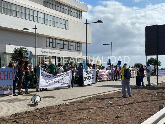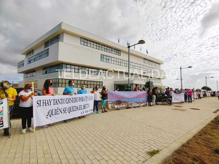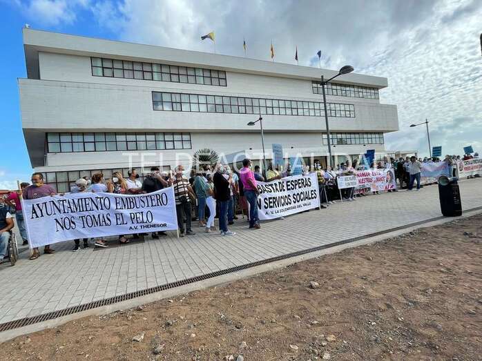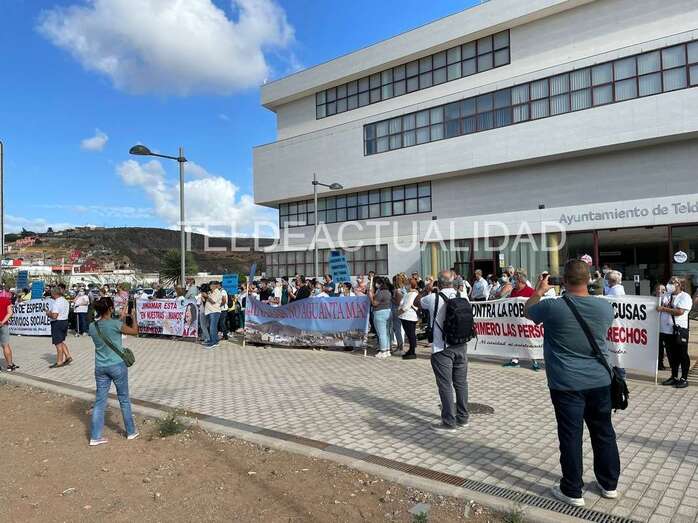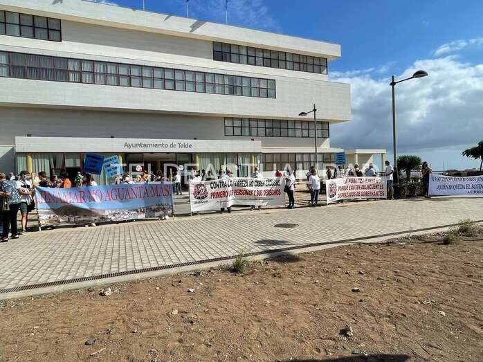Un grupo de vecinos del Valle de Jinámar, entre 125 y 150 personas, se manifiesta desde hace unos minutos delante de las puertas del nuevo edifico administrativo del Ayuntamiento de Telde en El Cubillo en exigencia de más atención para las familias vulnerables e infraestructuras de la zona.