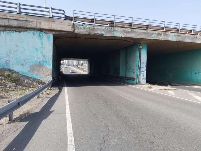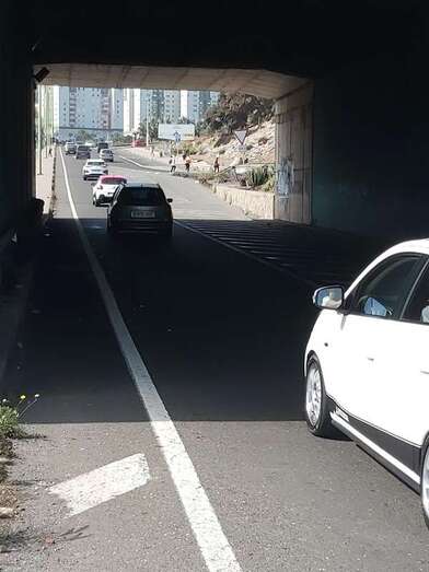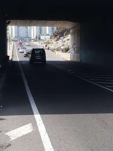 La falta de una acera en condiciones ha convertido el paso subterráneo que comunica el Valle de Jinámar con la zona del Centro Comercial Las Terrazas en todo un peligro para los viandantes, que tienen que invadir la calzada y discurrir junto a los vehículos.