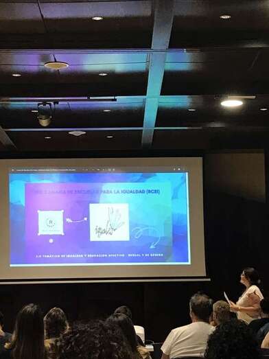 En su intervención titulada: Planes de Igualdad en los centros educativos canarios y su concreción en un instituto de Telde. La apuesta real por la coeducación, por un lado, han expuesto cómo se ha desarrollado la implementación de los Planes de Igualdad en los centros educativos de las Islas Canarias haciendo hincapié a las orientaciones marcadas por la Consejería de Educación, Universidades, Cultura y Deportes del Gobierno de Canarias. Por otro lado, se ha querido mostrar y compartir en un foro de tal importancia cómo se ha desarrollado en un centro educativo de nuestro municipio. Según reza en la ponencia presentada, ante la persistencia de las desigualdades entre mujeres y hombres, la coeducación es el reto para el sistema educativo actual. La coeducación, entendida como una pedagogía de aula, debe contemplar la igualdad entre los géneros pero atendiendo siempre a la diversidad sexogenérica existente en todos los centros y etapas educativas.