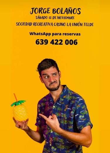 El Casino La Unión de Telde ofrece la noche de este sábado, 13 de noviembre, un espectáculo del hurmorista Jorge Bolaños. Será a partir de las 21.00 horas y para las reservas los interesados pueden contactar vía WhatsApp a través del 639.422.006.