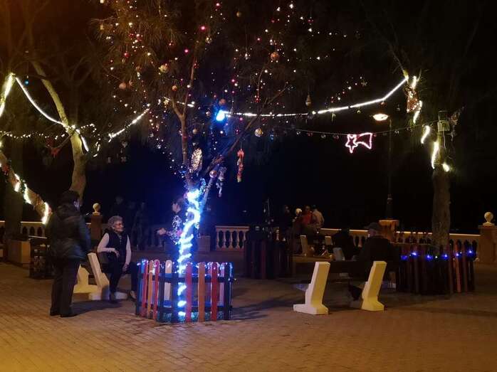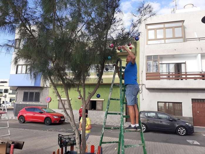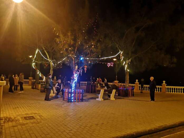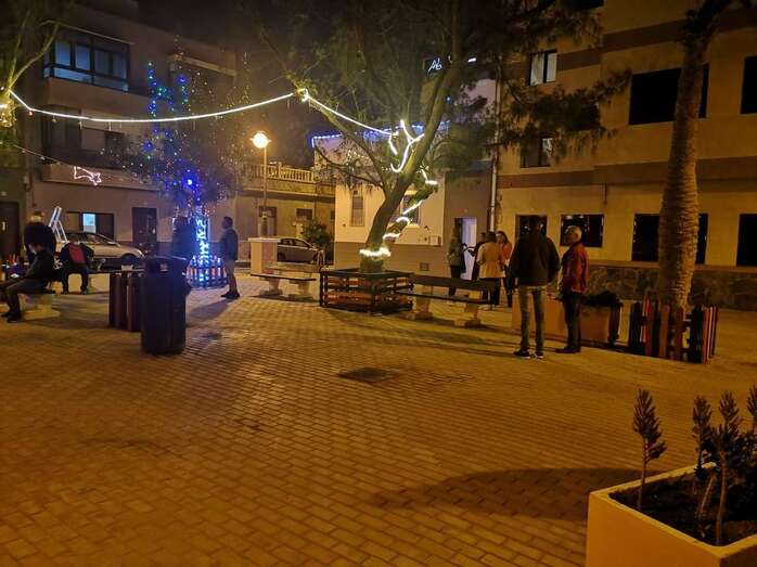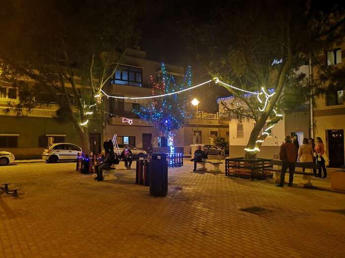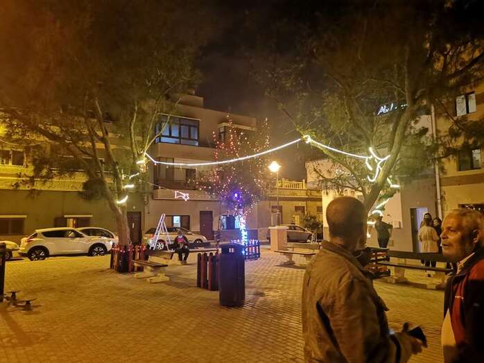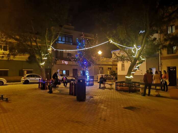 Un grupo de vecinos procedió esta tarde-noche al encendido de la iluminación multicolor y decoración propia de las próximas fechas en la Plaza de Los Pinos