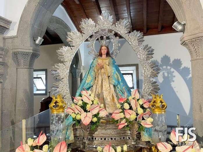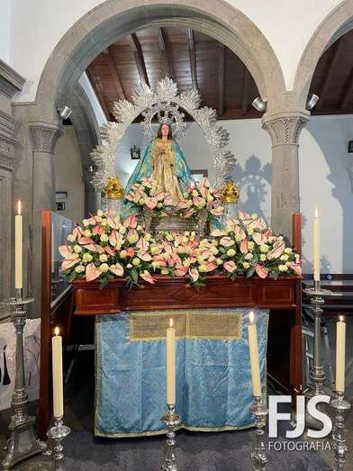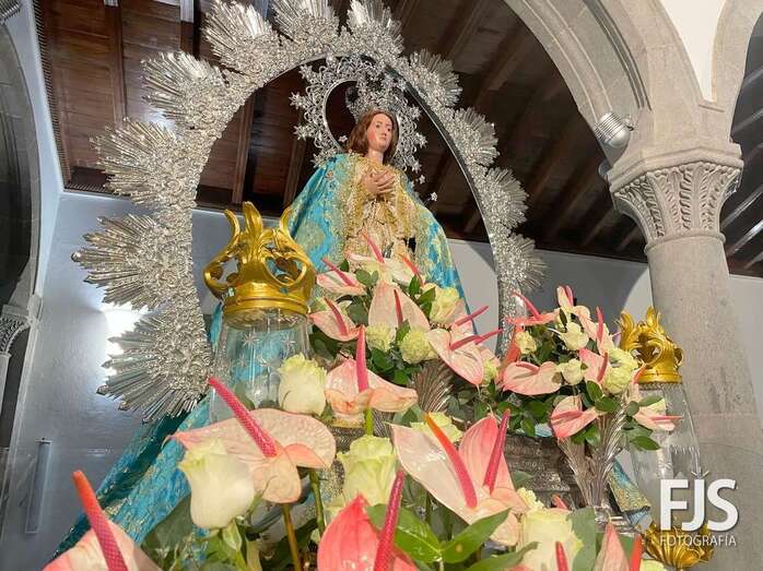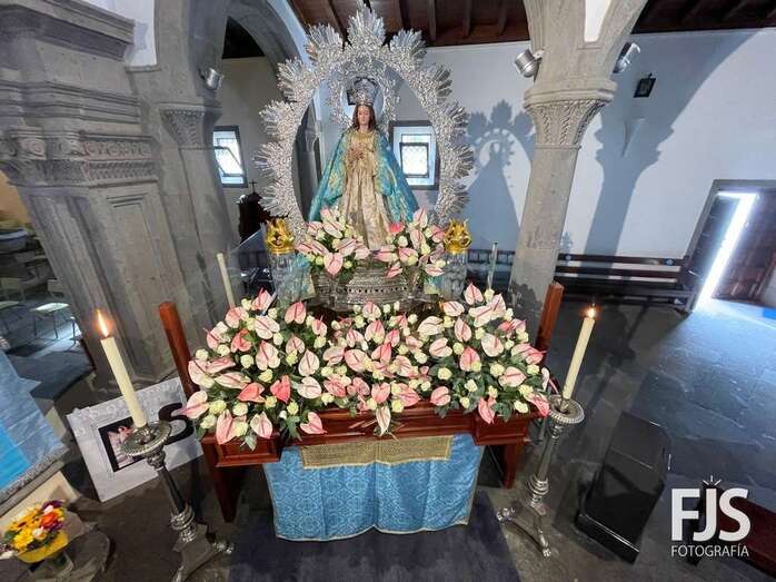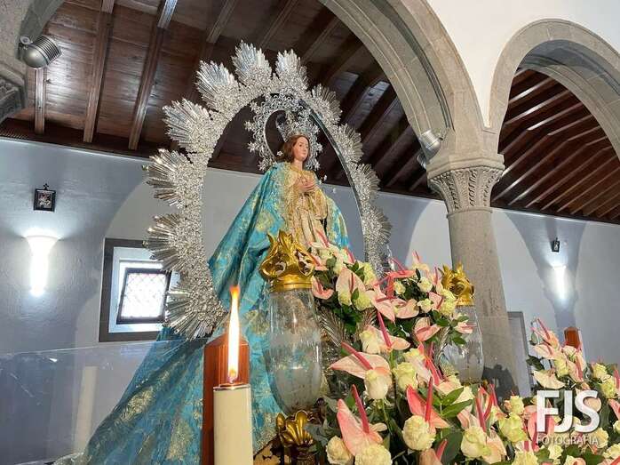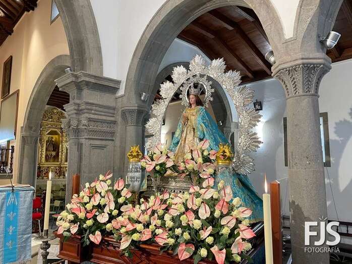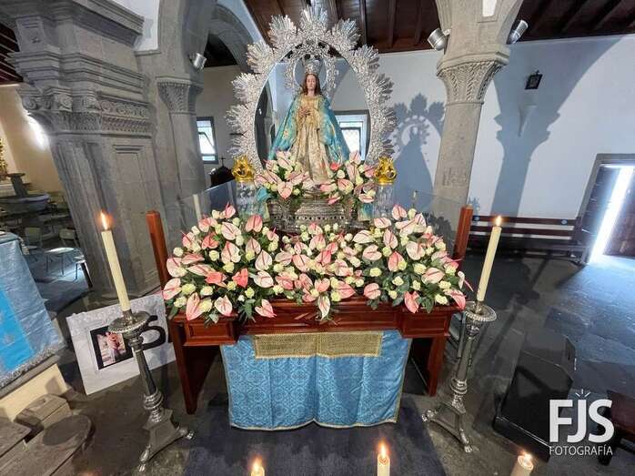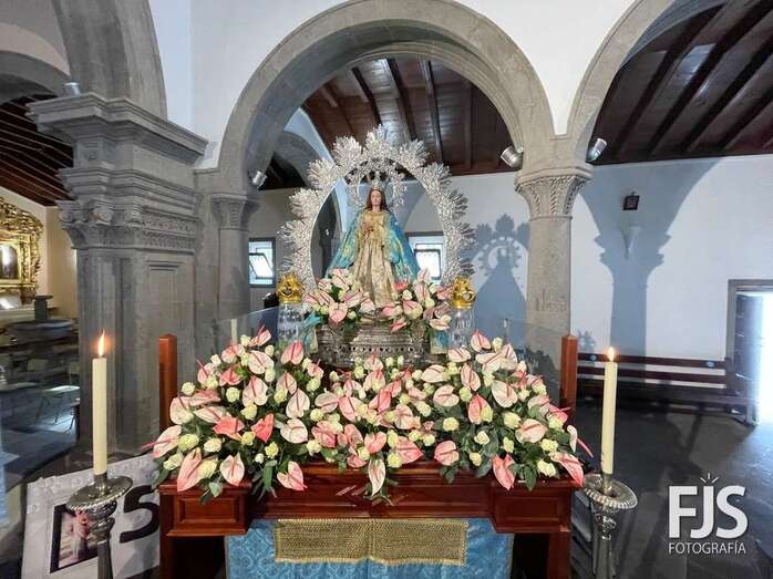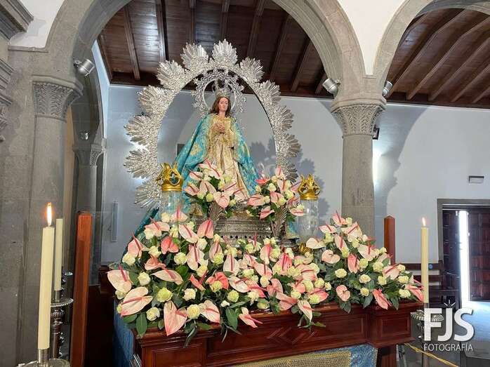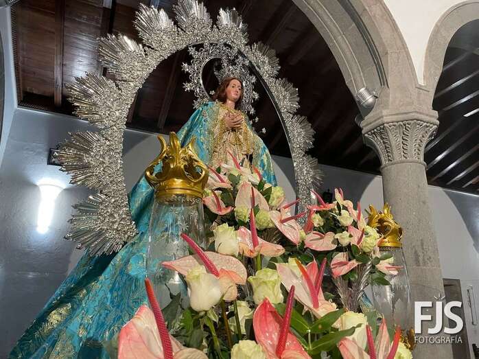El trono de la Inmaculada Concepción luce ya un precioso arreglo floral que exhibirá este miércoles durante los oficios religiosos en el interior del templo y en la procesión que tendrá lugar por las calles del pueblo de Jinámar después de la solemne misa del mediodía que será presidida por el obispo José Mazuelos.
