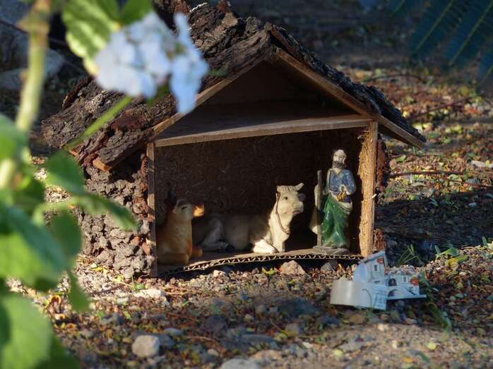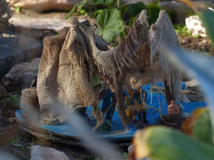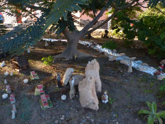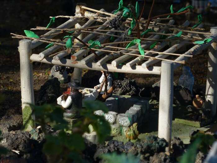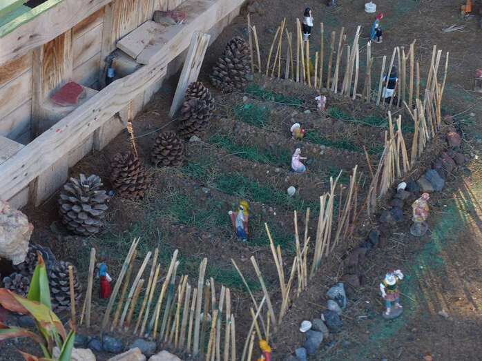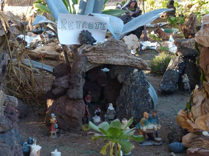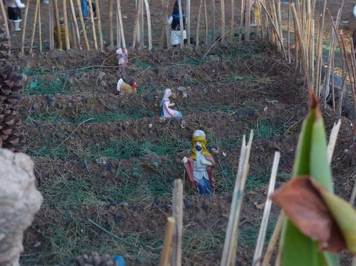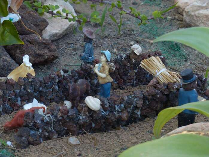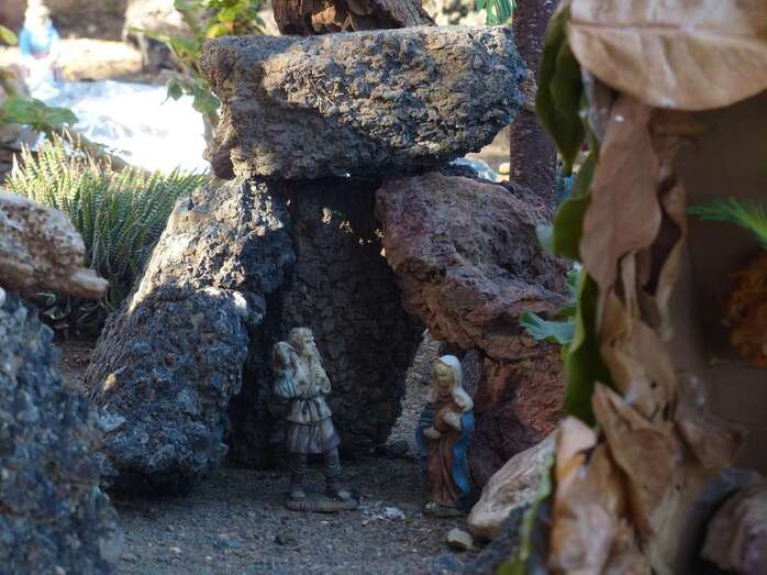 Además, también fabrica varios de los retablos y otros elementos figurativos que encontrarán su sitio en la escena. Este año dice que soñó con una pared de piedras, como las que delimitaban las parcelas o fincas, y ni corta ni perezosa se puso manos a la obra y elaboró un pequeño pasillo con esa idea.