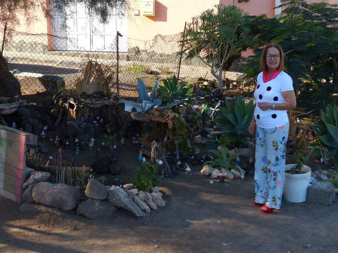 Hace ocho años, esta vecina de Telde tuvo la feliz idea de trasladar la típica escena navideña al exterior de su casa. Y tiene intención de seguir con esta costumbre, por lo menos mientras ella siga con esa voluntad de preparar este montaje.