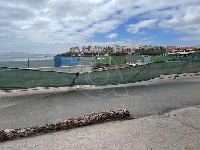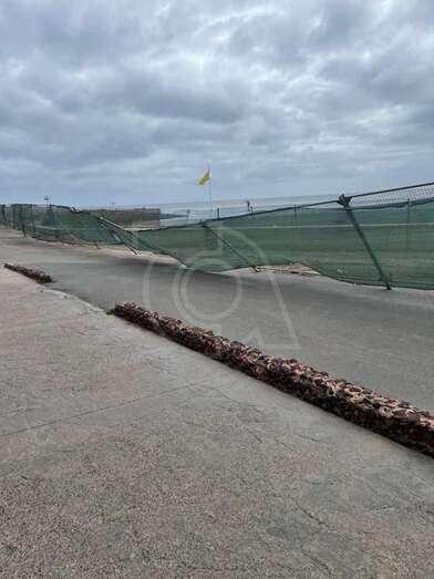 Los bomberos del parque zonal de Telde han acudido a Melenara a primera hora de esta tarde a recolocar el tramo del vallado de malla de la obra de remodelación de la avenida de Melenara que había sido tumbado por el viento.