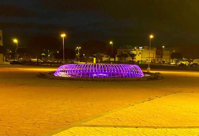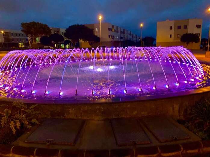 La fuente municipal situada en la plaza de la urbanización La Vega, en El Contrapeso, luce con sus chorros iluminados de color violeta, una acción con la que la Concejalía de Parques y Jardines, que dirige el edil Álvaro Monzón, ha querido sumar a la campaña del 8 de Marzo, Día Internacional de las Mujeres.